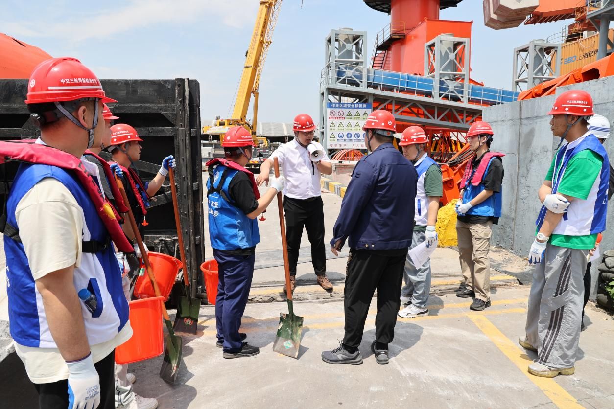 理论知识的学习离不开实践的检验。上午10时,码头突然响起急促的警报声——防台防汛应急演练正式开始。应急抢险组、通讯联络组、安全保卫组、医疗救护组、后勤保障组24名青年迅速集结,码头瞬间变身练兵场:物资转运健步如飞,排水抢险动作迅速,沙袋垒筑配合默契,设备锚定操作娴熟,医疗救援专业规范……仅用23分钟,新员工们便完成了预设险情处置任务,比预案提前7分钟。
