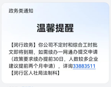 “叮咚!”随着一声清脆的手机提示音,一家制造企业人事负责人陈先生收到了一条来自闵行区人社局的特殊短信:“你公司不定时和综合工时工作制审批将于两个月后到期,请及时登录一网通办平台提交延续申请,详询33883511”。陈先生长舒一口气,“多亏提醒,差点因超期影响生产调度”。
