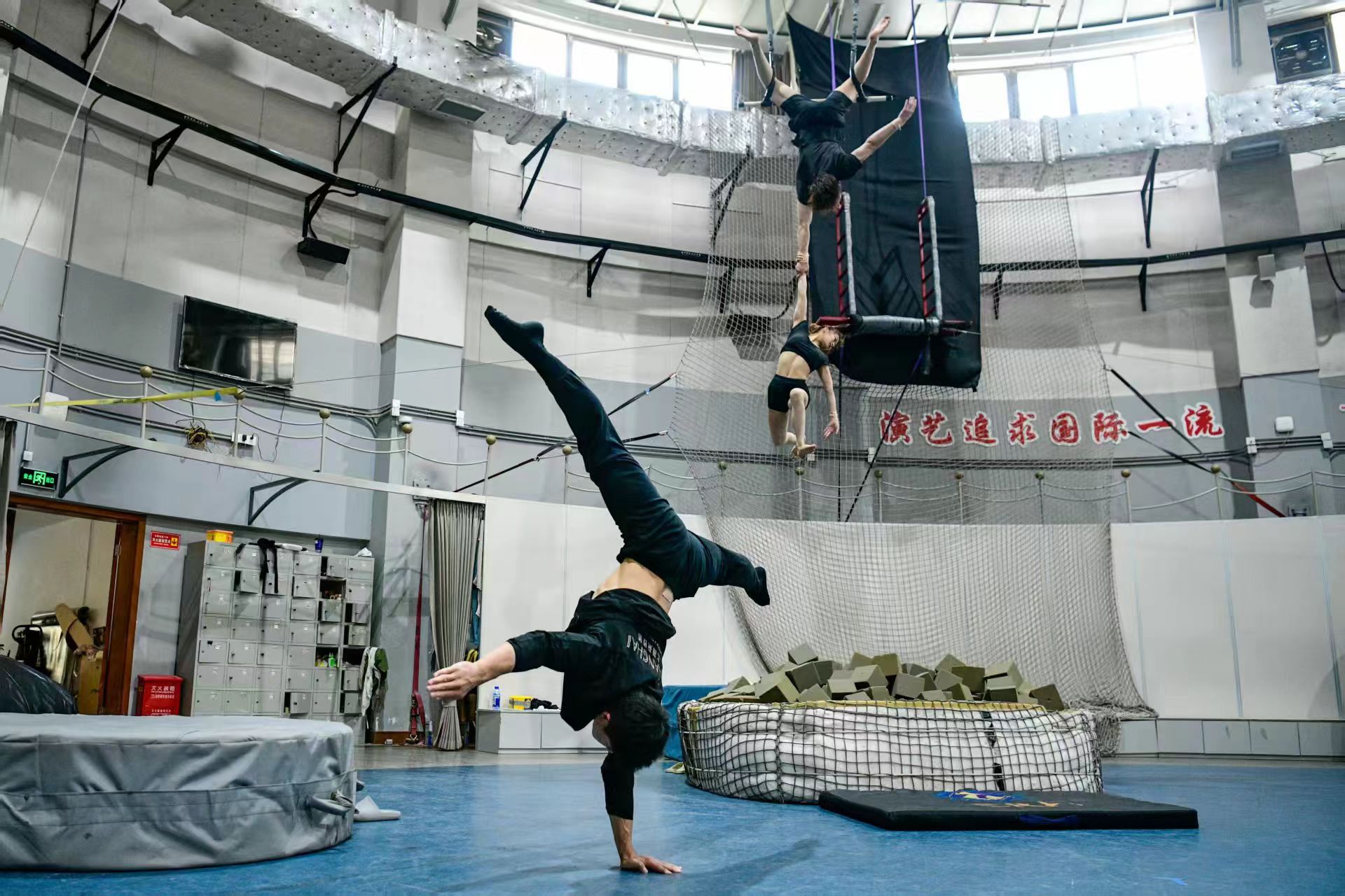 头图为上海杂技团演员们在练功房里打磨技术。颜筱依 摄影