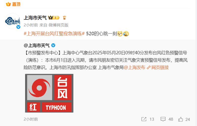 台风要来了?5月20日,有市民表示上海气象局的官微发布了台风红色预警信号,对此气象部门强调,这只是演练信号。