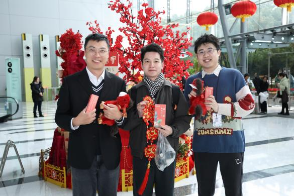 当天清晨,一场春雨如约而至。信息大楼大堂内,“一马当先”“福马贺岁”等标语醒目亮眼,马年主题装饰与红灯笼、福字相映成趣,节日氛围浓厚。8点起,员工陆续返岗,在一声声“新年好”中开启新一年的工作节奏。