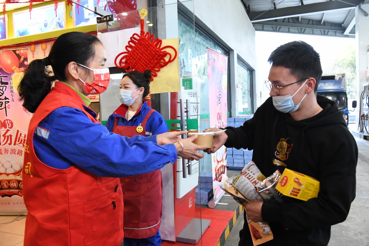 “师傅,您辛苦了!来吃碗汤圆,祝您元宵节快乐!”正月十四,来中石化上海石油分公司环隆加油站加油的司机钱师傅刚下车,该公司的志愿者许文便跑来为他送上了一碗热汤圆。今明两天,该分公司旗下全部高速和环线共31座加油站举办“佳节送汤圆,温暖奔波路”活动,员工和志愿者们在泵岛上和便利店内请过往的司机和客人免费品尝热汤圆,让车友感受节日的浓浓暖意。