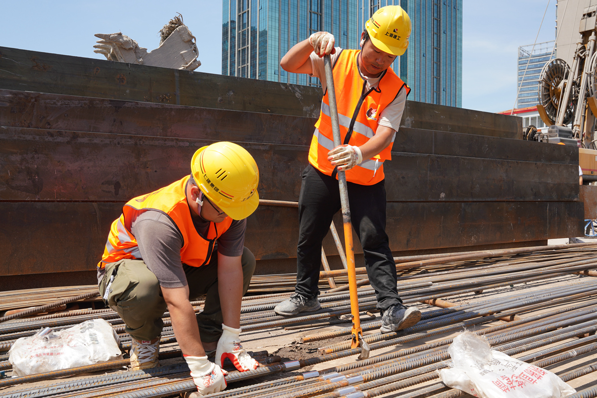 据介绍,“两头班”模式即实行早开工、早收工,避开太阳最火辣的时间段。但即便避开了高温时间段,露天作业下,钢筋依旧被烤得炙热,隔着橡胶手套,张洪滔熟练地操作着工具钳,精准旋紧钢筋连接套筒,热汗也淌在他的脸颊上。
