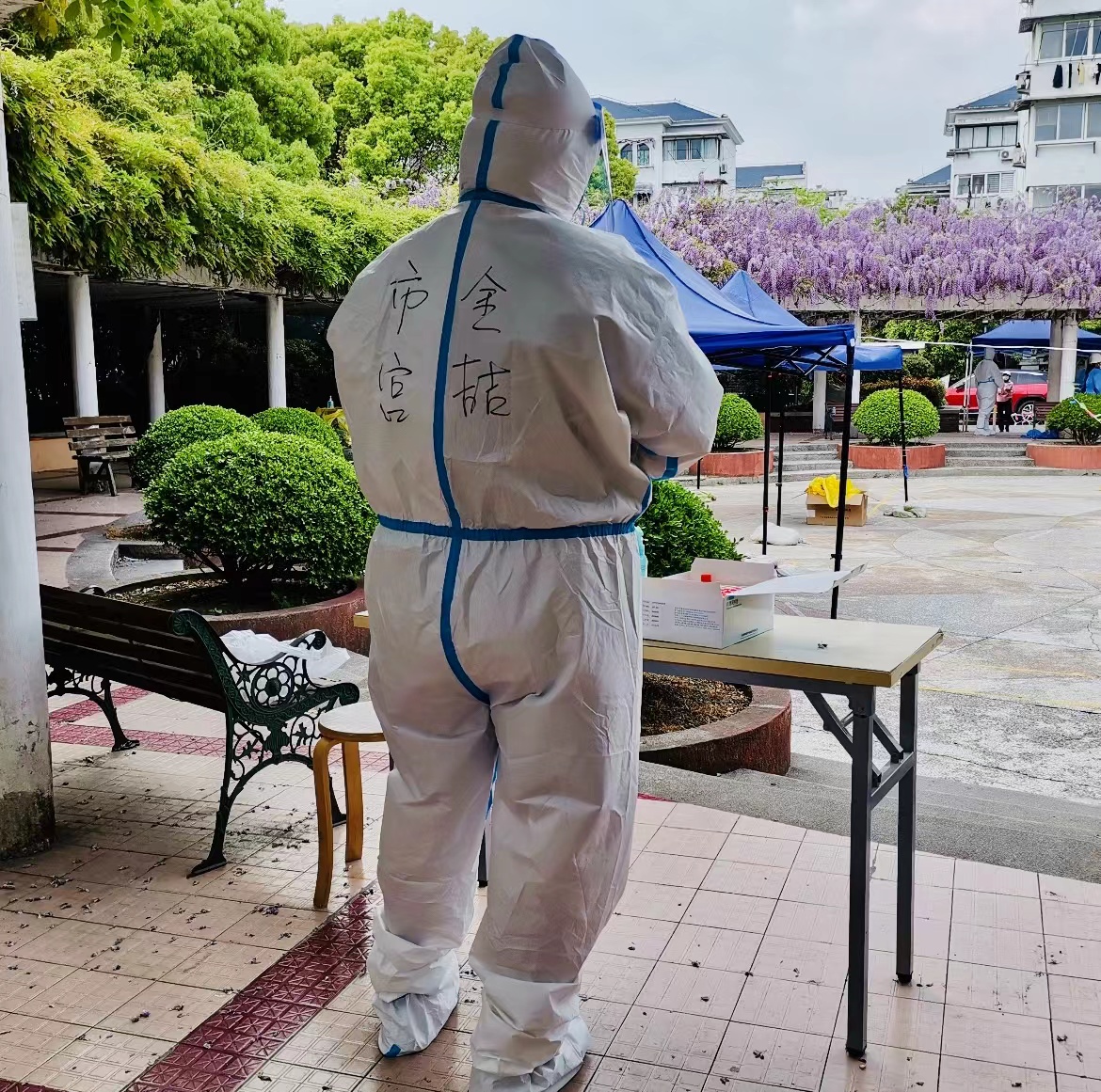 金喆是一位人高马大身形健硕的小伙子,他有些不好意思地对记者说“大白的制服,我穿最大的号都有些紧,4月中旬有两天,一天是大太阳,一天是暴雨天,我深刻体会了制服的两种湿法,一种是从外湿到里,一种是从里湿到外。”值得一提的是,每一次外出做志愿者,他都会把“市宫”两字写在自己的制服上,“有一些小私心吧,我很想疫情结束后,让更多邻居去我们工匠馆逛逛,已经有邻居在做完核酸时来问我,你们市宫现在是不是有多展览,到时你给我们介绍介绍。”金喆告诉记者,这一次的疫情让自己成长不少,“第一次跟着医生去阳性病例的楼栋里扫码录入信息,我心里其实很紧张,但看着医生们从容不迫,一往无前的模样,自己内心也瞬间有了力量。”