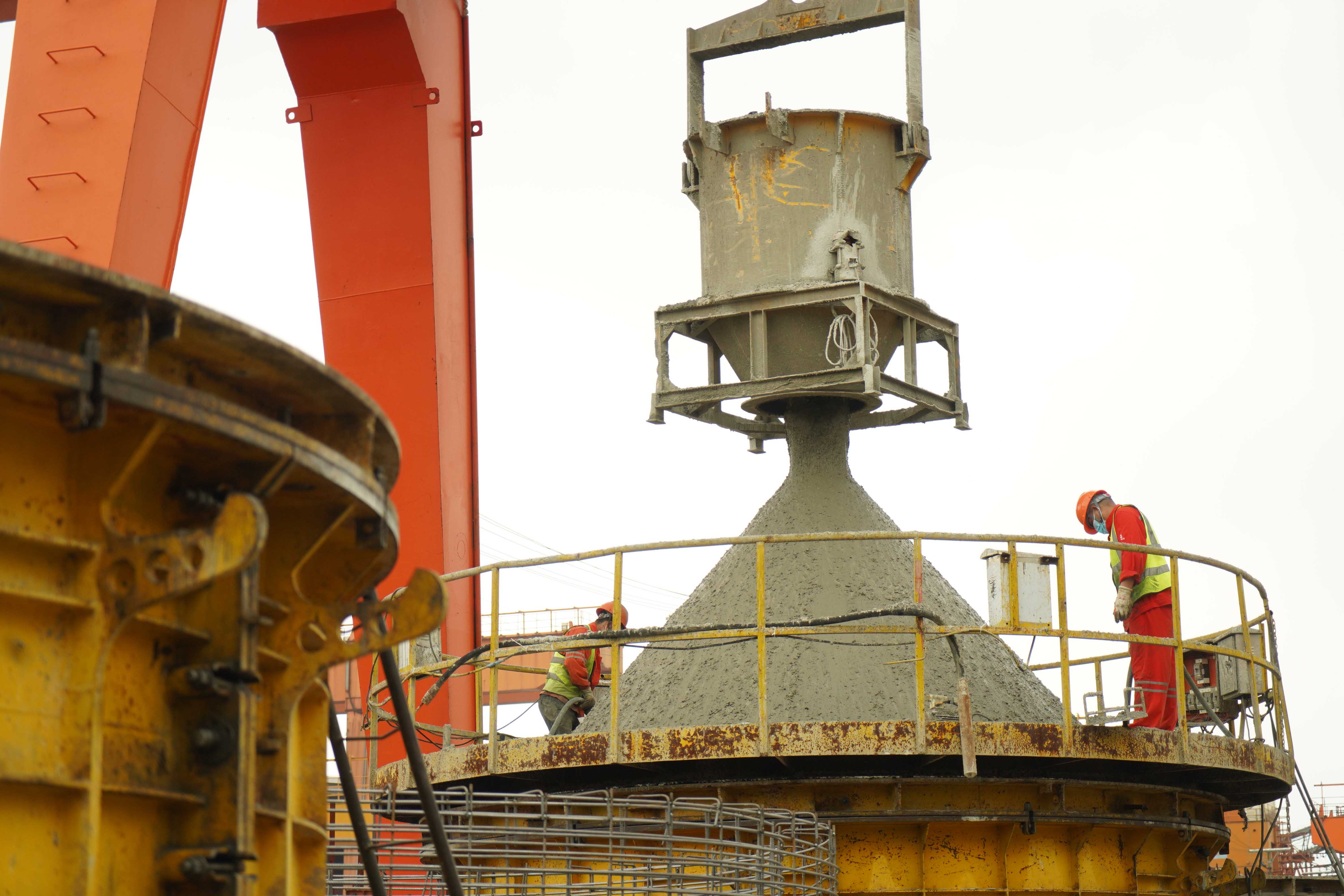 在一个目测高约3米的圆柱形钢模上,来自四川的张平武和杨成法正忙碌个不停。在钢模的内外模中间,正摆放着此前环节加工好的“骨架”。搅拌好的混凝土,将通过将军帽均匀浇筑在钢筋骨架之间,而两人要做的,就是手持一根20斤重的振捣棒,不断将内部松散的混凝土振捣紧实。虽然震动由机器的动力提供,但是强烈的阳光下手持重物工作,汗水还是很快就从两人的脸上滴下。