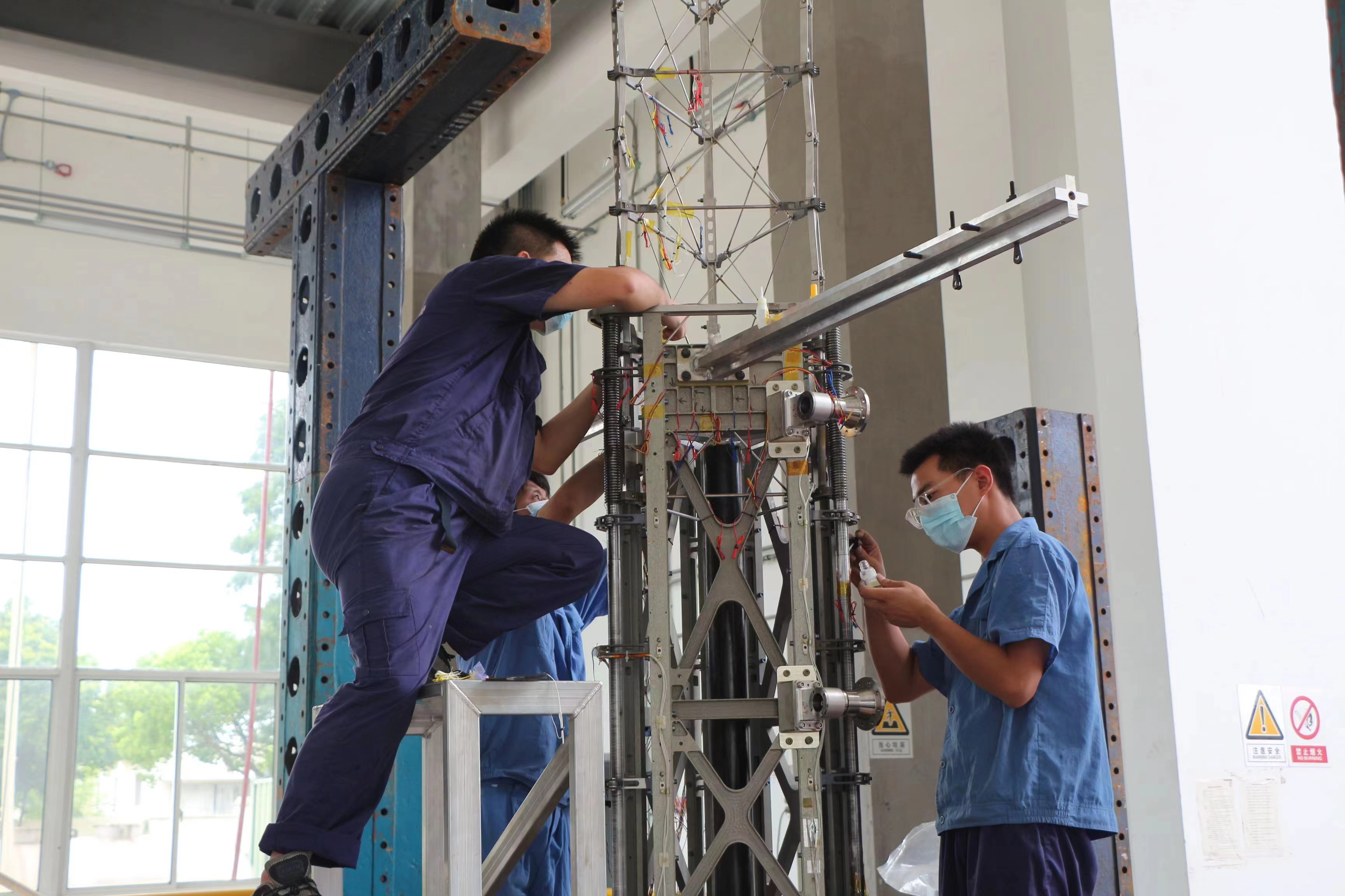 伸展臂由71节可折叠的铰链杆组成,重量仅为80公斤,精细程度可想而知。这一柔性机构,试验过程中距离地面约25米的顶端可发生约1.5米的大幅度摆动,为此,团队自主设计了刚度强、变形小的固定工装,通过16个可调节高差的拉杆,保持水平0度,让这个柔韧的“巨人”牢牢的“扎根”。