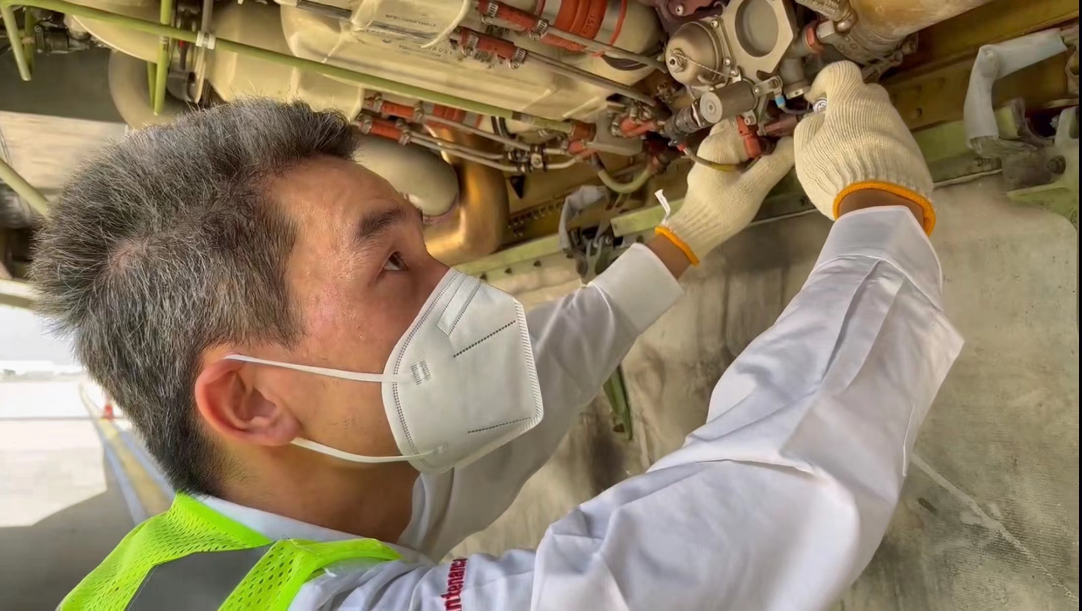 “戴着这个才叫考验”,老张指了指脸上的口罩说,由于机场防疫规定,机坪作业必须佩戴N95口罩,这让高温下的维修工作变得更加困难。“一个小时就得换新的,因为湿掉之后就没法透气了。”