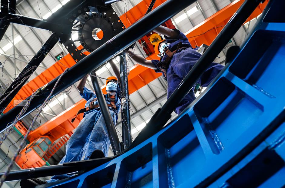 “现在条件好了,登高爬上六七米高的梯子,安全也提高了。”金师傅回忆说,在过去装备还没有升级到升降车时,登高作业全靠爬上六七米高的铸块。说话间,安装工钱剑从设备底部从大约仅有半平方米大小的“人口”钻出来,仅仅在里面呆上一会儿,他的额头已经遍布细密的汗珠。由于底部的内部空间受限,钱剑只能一步步挪着走,而在大量的测试装备里,这还算得上舒服的。由于一切测试紧跟产品,特殊产品规模大小不一,究竟如何开展工作完全取决于需要测试的产品型号的规模尺寸。而就在几天后,一套大型产品由于高度过高只能在户外进行测试,挑战更为严峻。