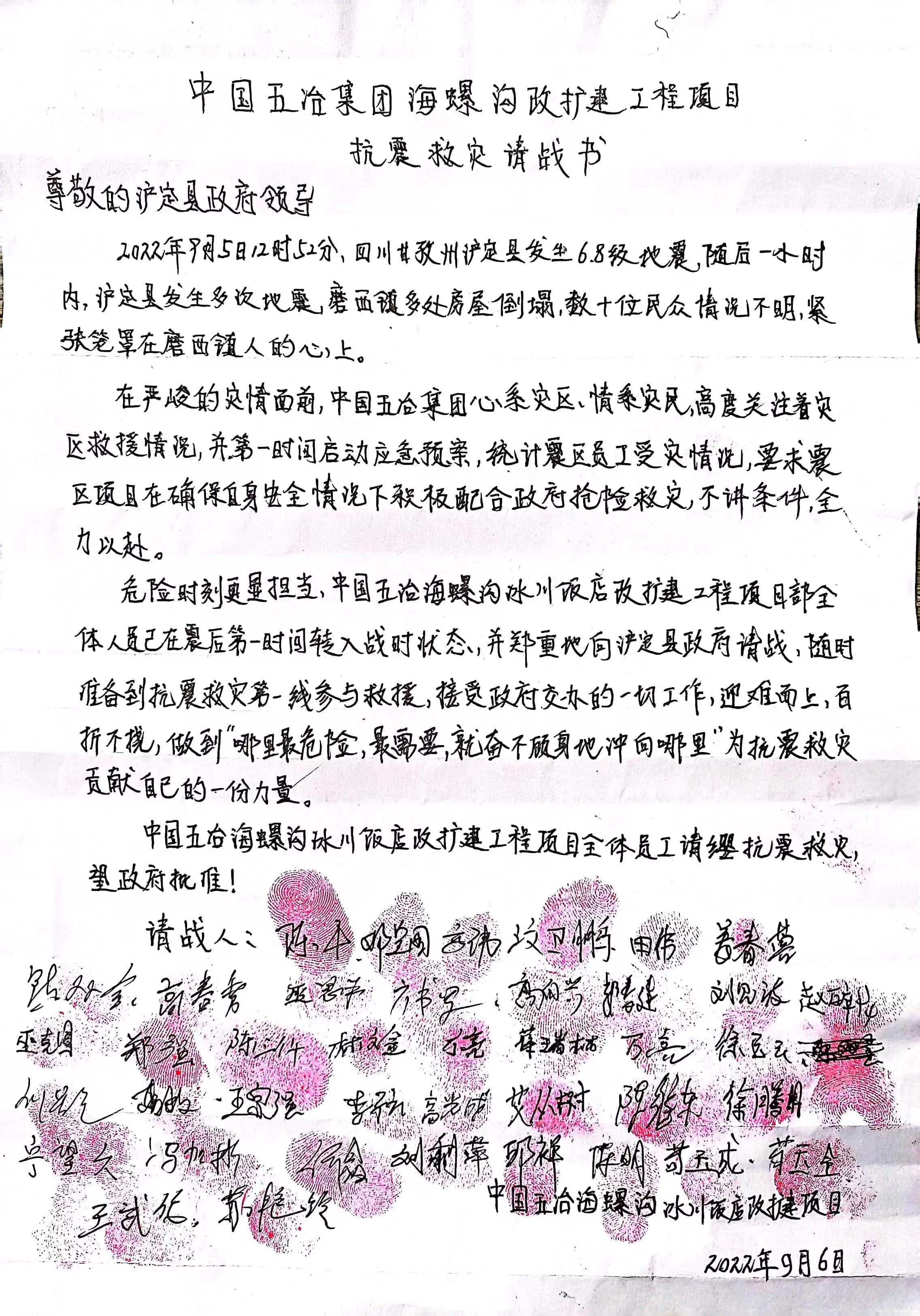 包括汶卫鹏在内的40人,在9月6日向当地政府递交了抗震救灾请战书,表明“随时参与到一线救援,不讲条件,全力以赴”的决心。