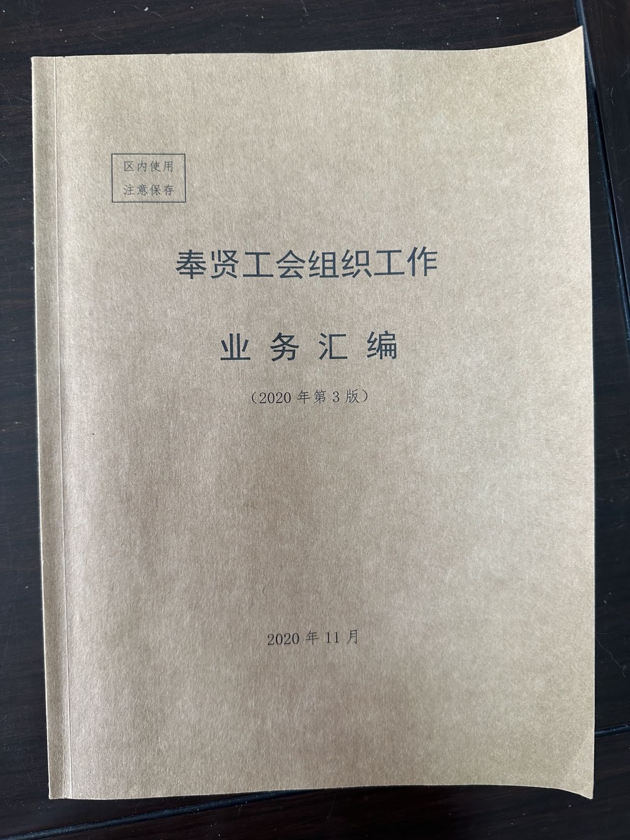(陈钢从奉贤区总工会拿到一本厚厚的工会材料,扩充工会工作理论知识。)