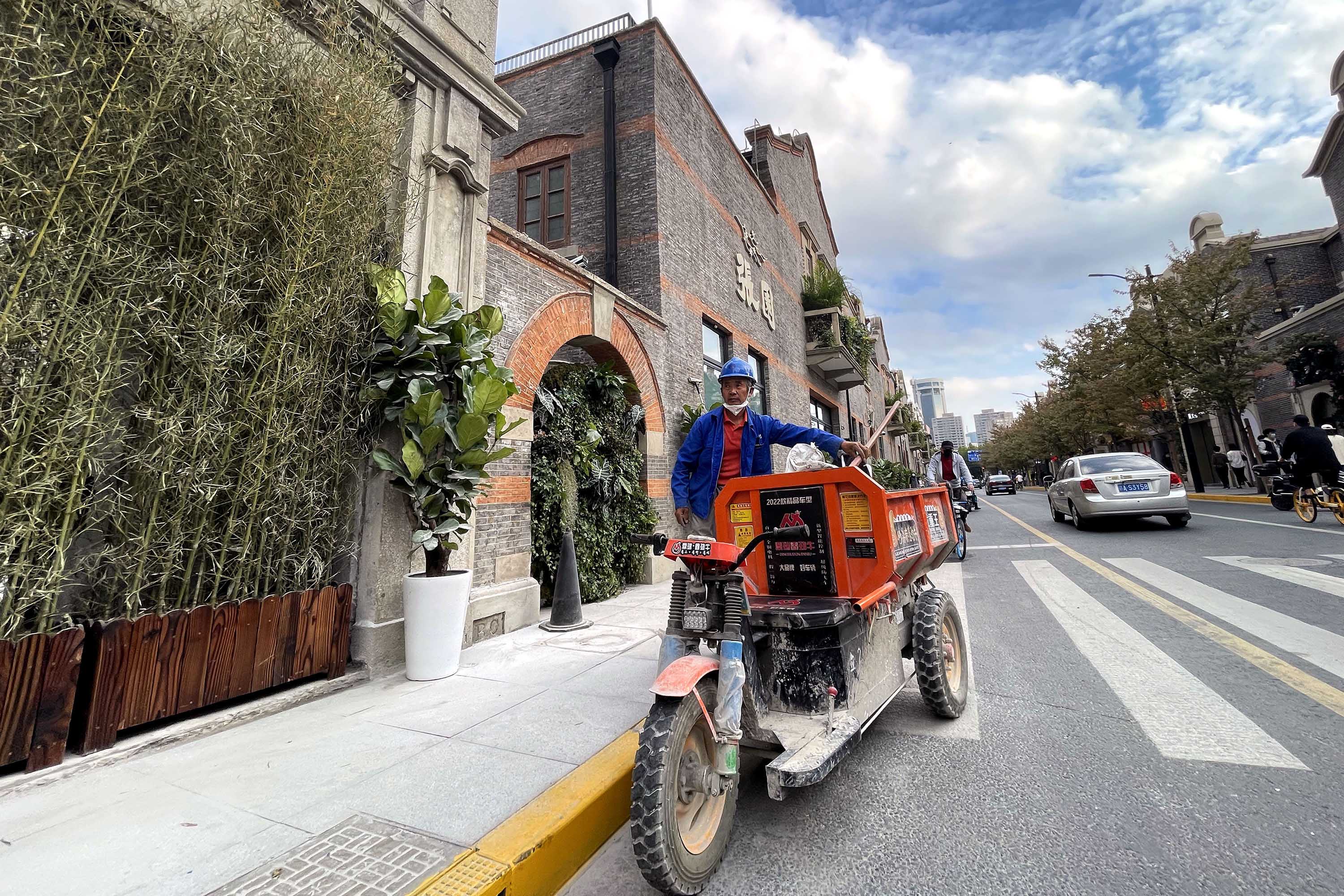 (头图为修缮施工人员正准备清理张园外沿人行道上的混凝土碎石。)