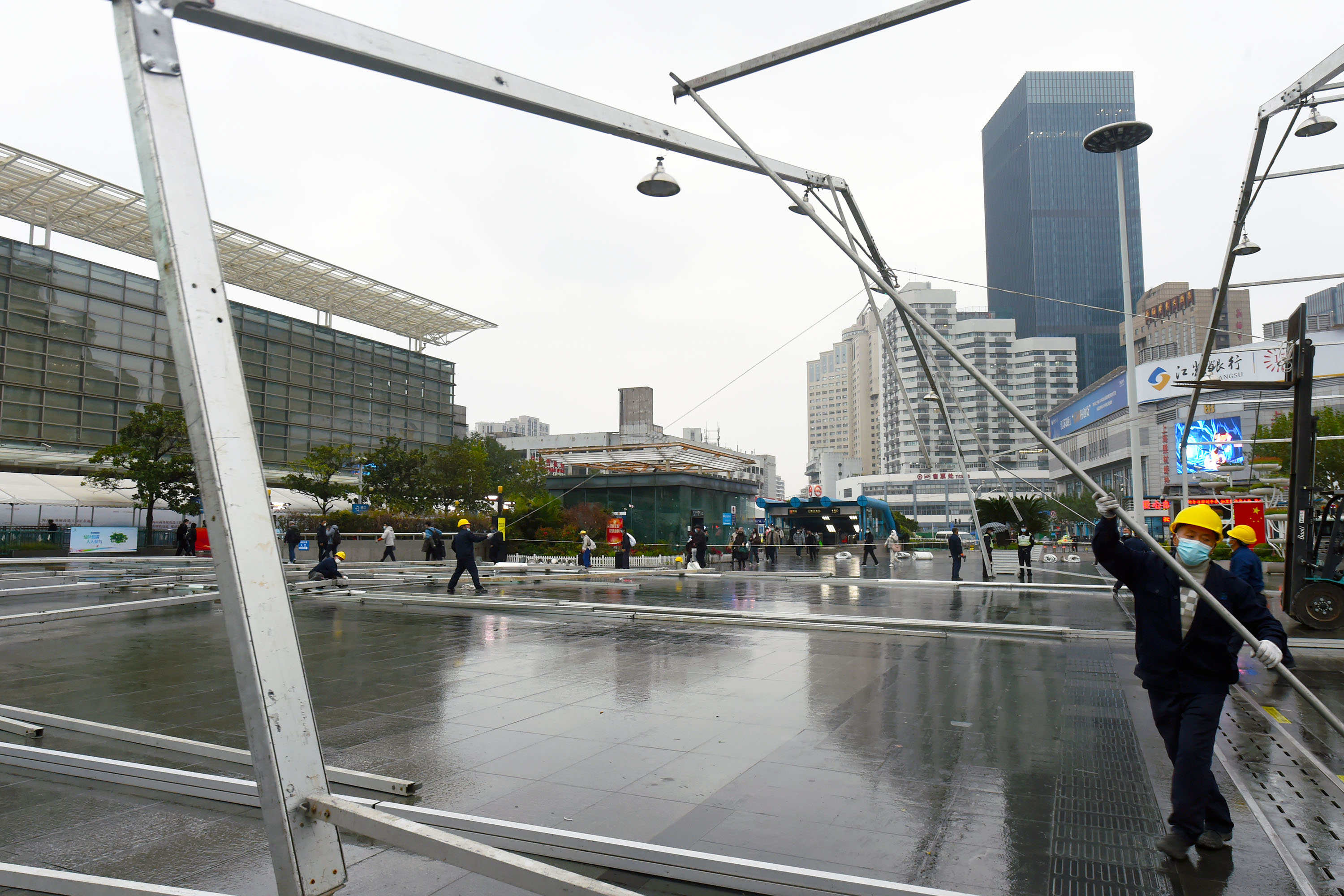 (铁路上海站,工人正在拆除此前为方便大面积“落地检”搭建的核酸检测大棚。)