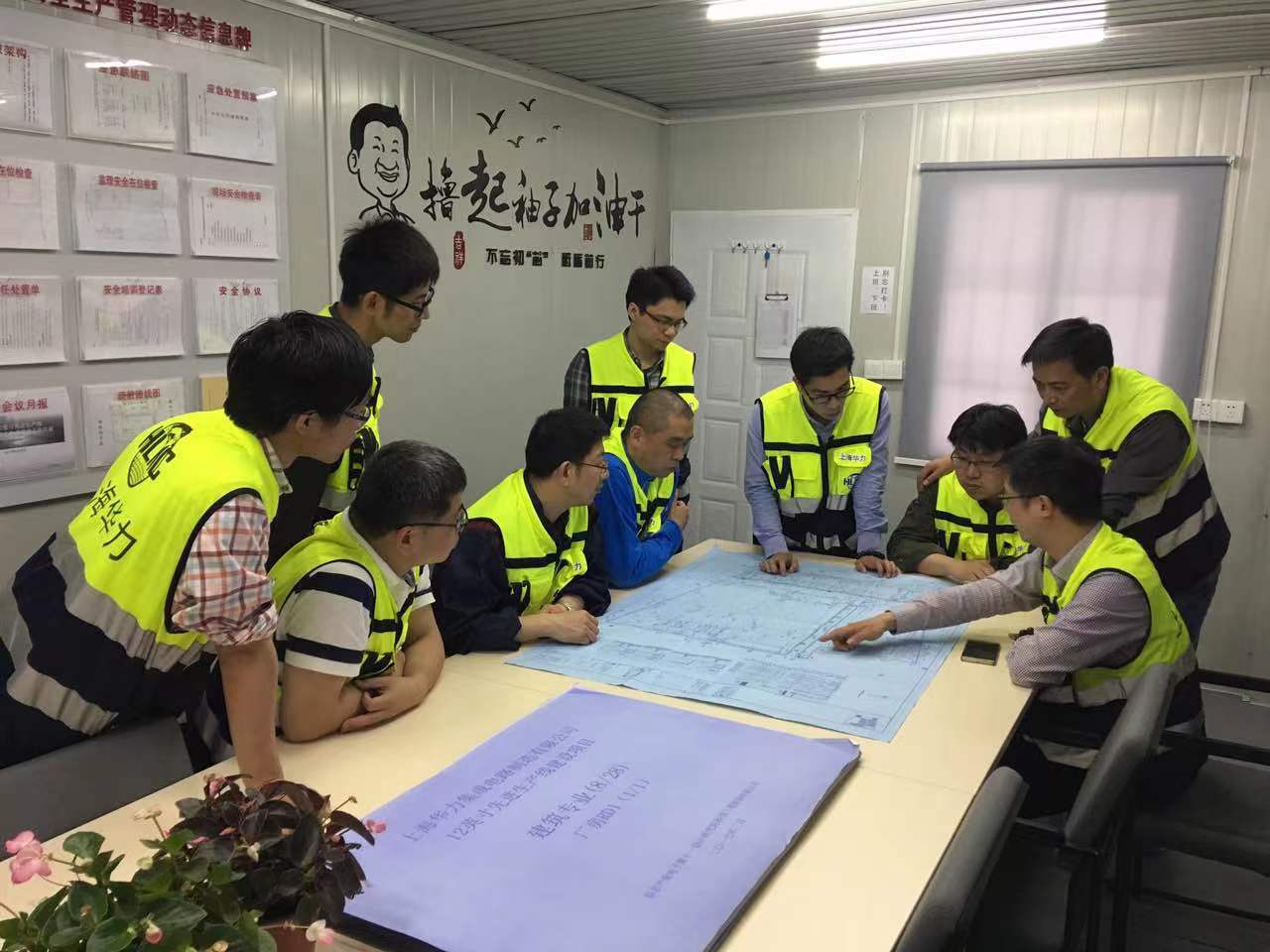 头图为张悦(右一)与项目团队成员一起讨论施工进程