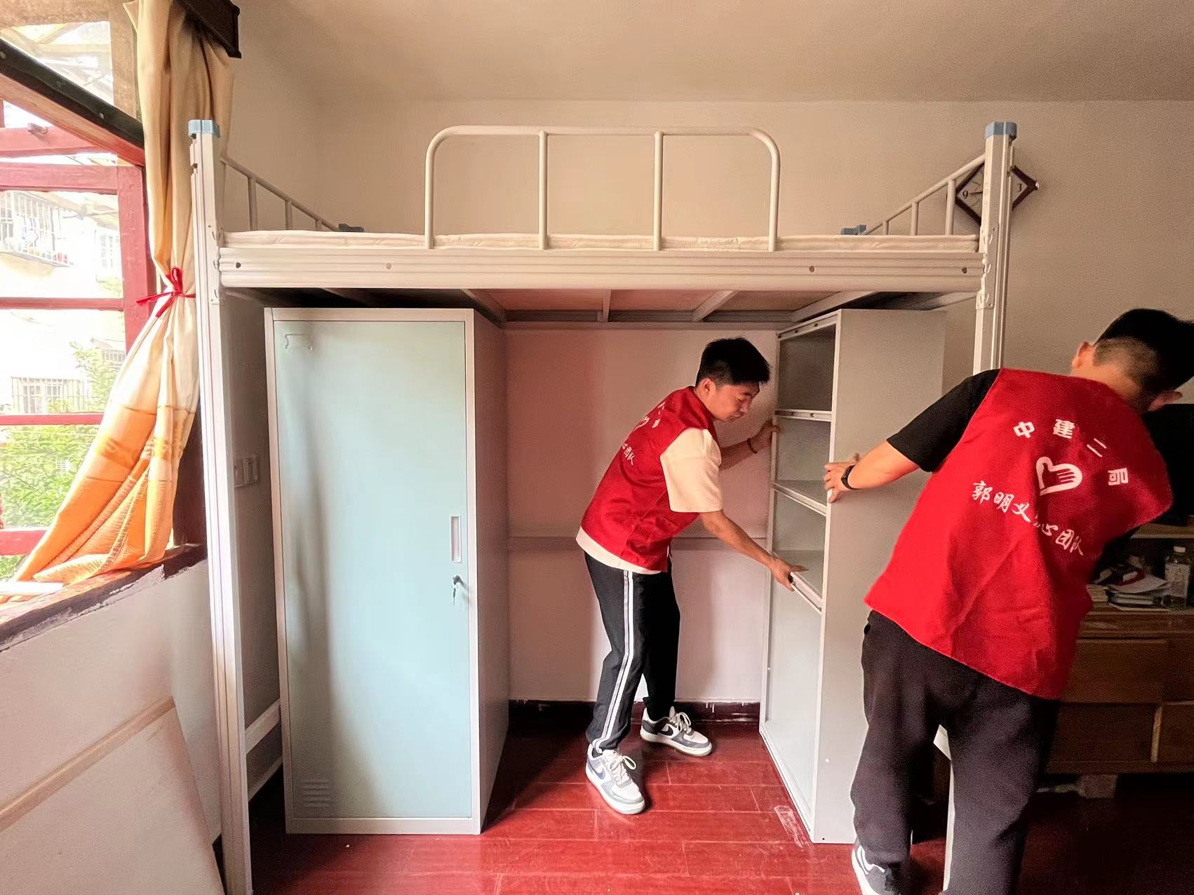 头图:中建二局华东公司职工志愿者正在安装上下床。