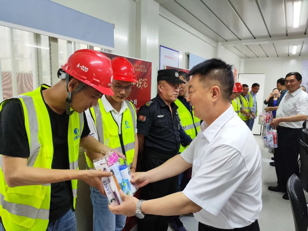 近日,街道党工委书记贾跃能、副书记蒋寒青,街道总工会主席徐志新、副主席张永轩等一行,顶着瓢泼大雨来到玉屏南路上的区档案馆建筑工地,与相关负责同志进行沟通,了解安全生产情况,向一线工人宣传“安全生产月”活动精神,并开展了高温慰问。