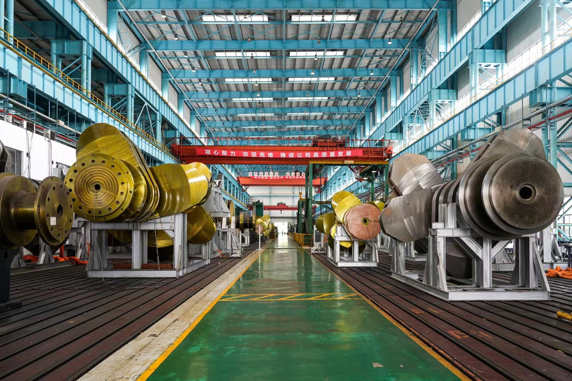 车间一隅的920mm缸径大型曲轴生产区域,钳工们正在专心致志进行拼接孔加工,只见他们反复测量、校调,汗水浸透了他们的衣裳。“这道工序考验的就是校调水平。”技术人员吴凡向记者介绍,“920mm缸径大型船用曲轴是大功率低速船用柴油机的关键核心部件,总长度超20米、重量近400吨,采用分段式加工拼接而成,当前我们正在做的,就是将两段曲轴拼接成为一个整体。”