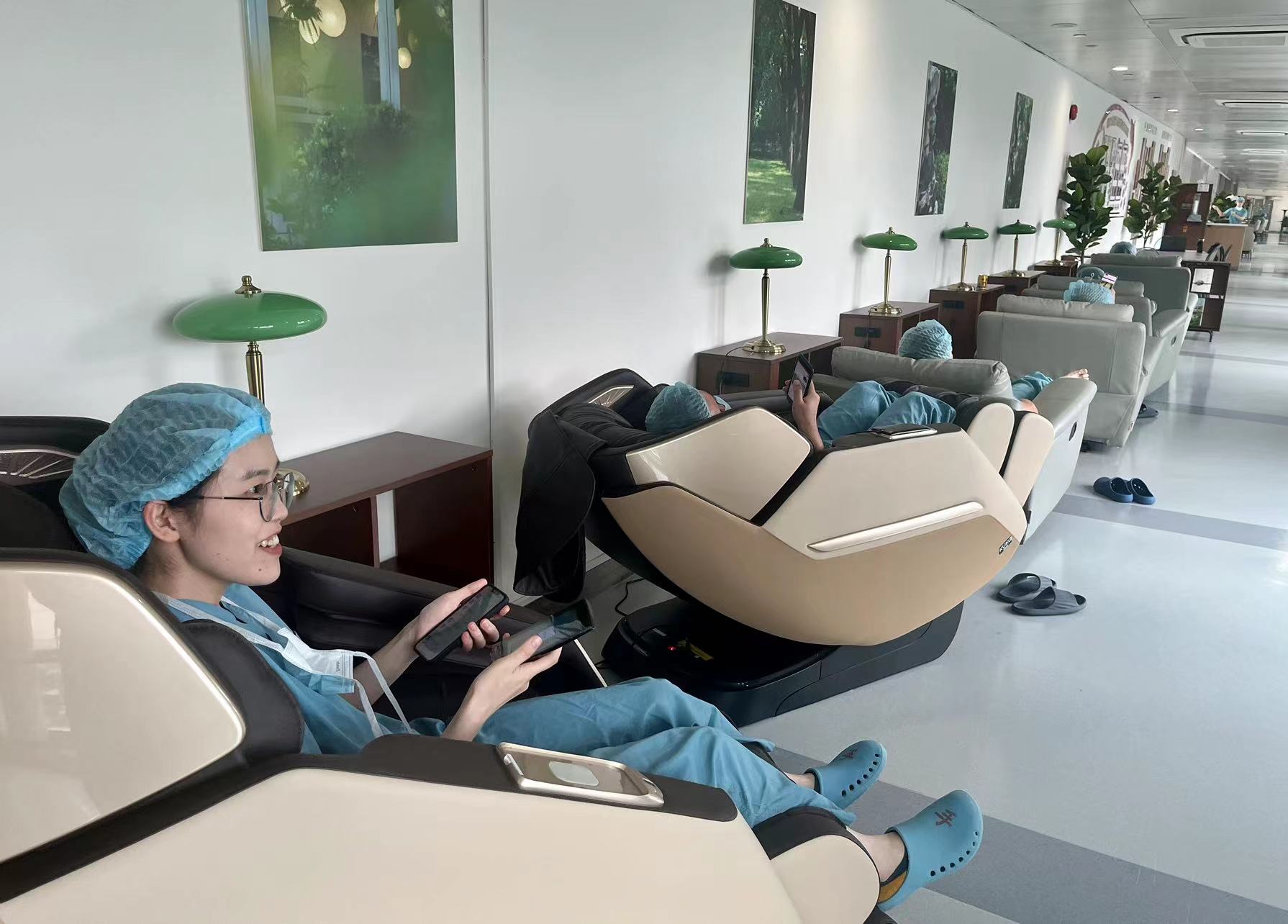 下午三点,瑞金医院手术室连廊休息区,十余位刚做完手术的医生和护士正躺在按摩椅上放松,在手术接台的等候时间里,他们正在抓紧休息放松。瑞金医院的这处长达百米的连廊此前的作用是连接6号楼和10号楼两个手术室,方便通行。瑞金医院总院每天要进行约300台手术,医护人员约500人,此前原有的手术休息区狭小局促,条件艰苦,无法满足医护人员休息的需要。在对此处完成改造后,按摩椅、沙发椅、圆桌、吧台等整齐摆放,可以同时给40多位医护人员提供休息、充电以及小型会议等功能。最为重要的是,工作强度极大的医护们有了一处全新的休憩港湾,一位刚做完手术的外科医生使用着按摩椅说道:“现在每天都要来这里按一下,对我腰部和肩颈都有放松舒缓的作用。”