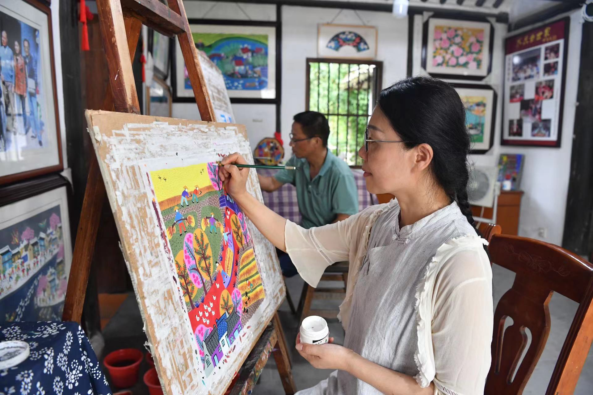 “父辈的年代,画画是他们务农之外的重要休闲方式之一。父亲常说,干了一天农活很累,坐下来画幅画身心轻松。”在陈惠方看来,金山农民画的根在乡村,其创作灵感来源于生活,是农民耕种之余的一种生活方式。