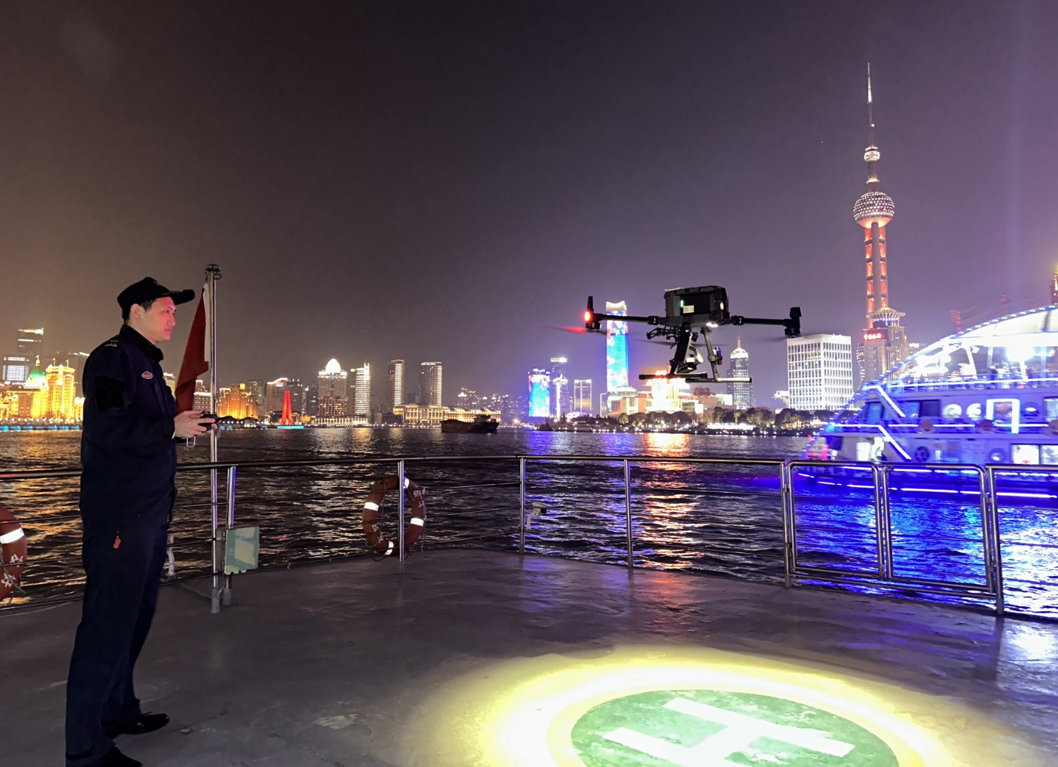 元旦游览高峰时,陆家嘴至十六铺、3号掉头区水域等客船密集,黄浦海事局一位掌握“黑科技”的职工特别加盟水上监管,无人机执飞18架次,通过喊话提醒客运船舶安全航法,规范客运船舶靠离泊、掉头等航行秩序。此外,黄浦海事局运用“一网统管”黄浦江核心段客运安全监管模块,通过可视化、动态化实时显示,精准掌握游览船航班动态、精准气象预报信息。