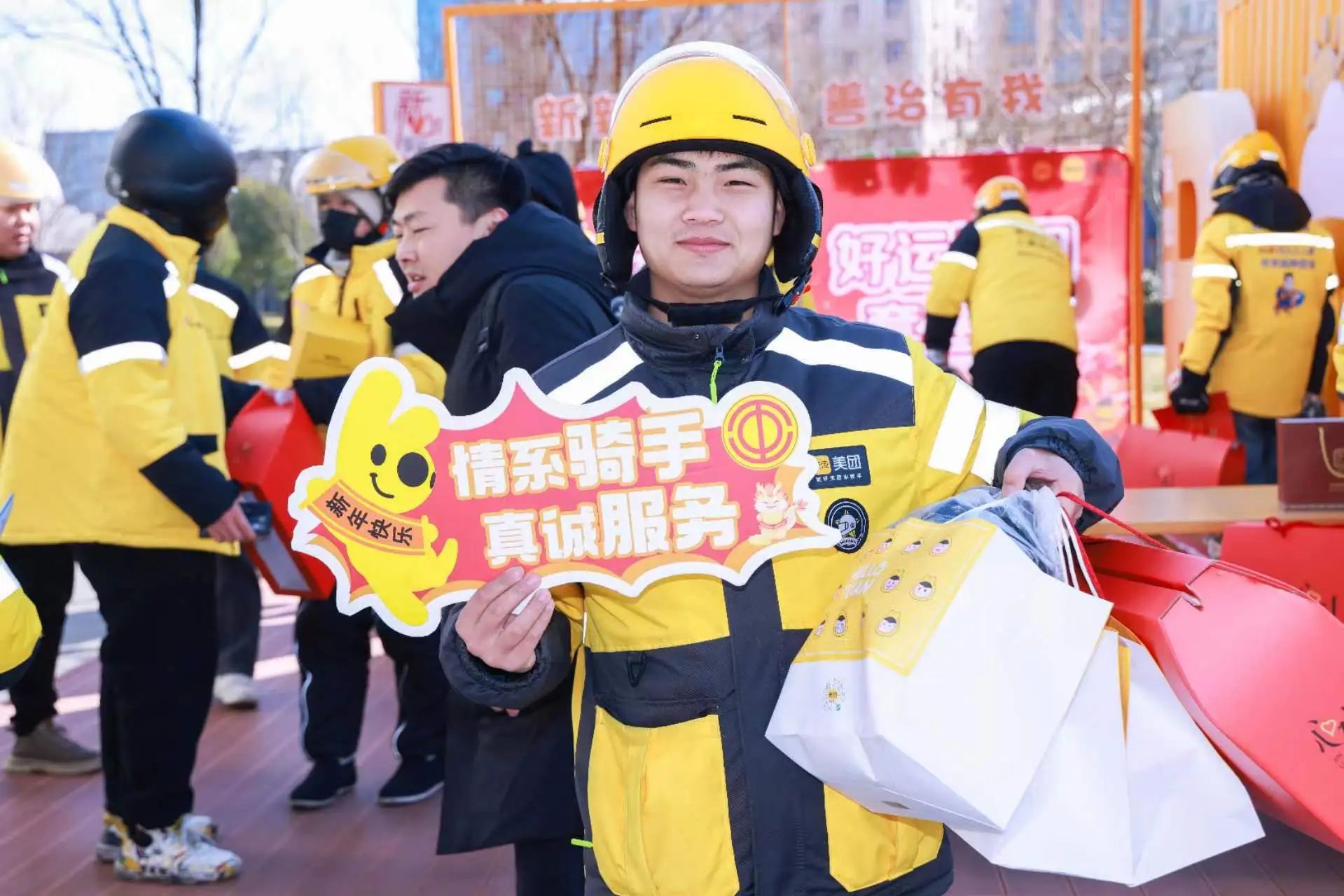 活动现场,领导为美团优秀骑手送上了新春关爱大礼包,并叮嘱他们近期气温骤降,要注意防寒保暖、保重身体。