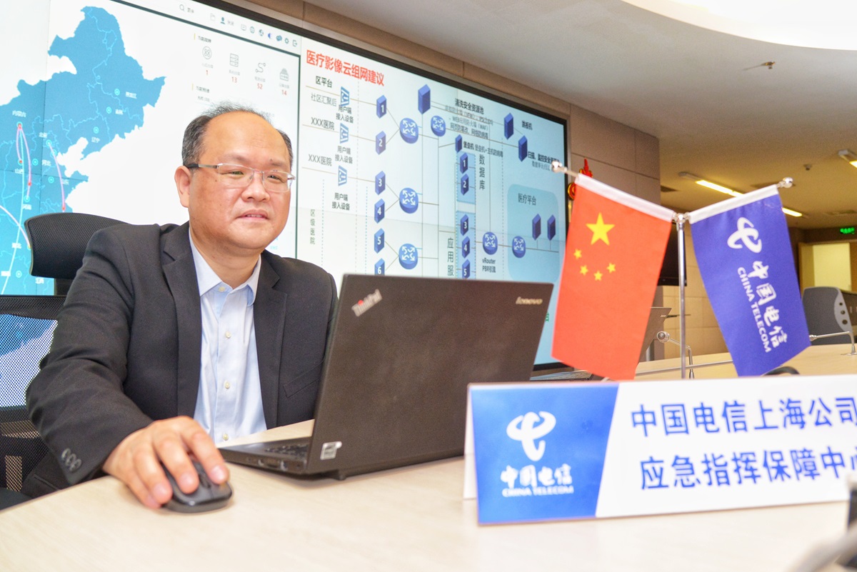 头图:胡晓宇在上海电信监控中心对政企客户的云网应用进行优化