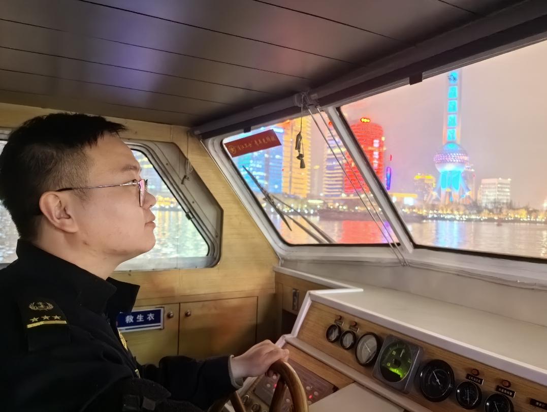 2020年入职的鲁一帆是外滩海巡执法大队的一名海事青年,今年已经是他连续春节值守的第三年。十几年前,鲁一帆曾与家人一起以游客的身份坐过黄浦江上2元一次的过江轮渡,未曾想到,多年以后他从家乡来到上海,成为了守护外滩水域客运安全的海事人。
