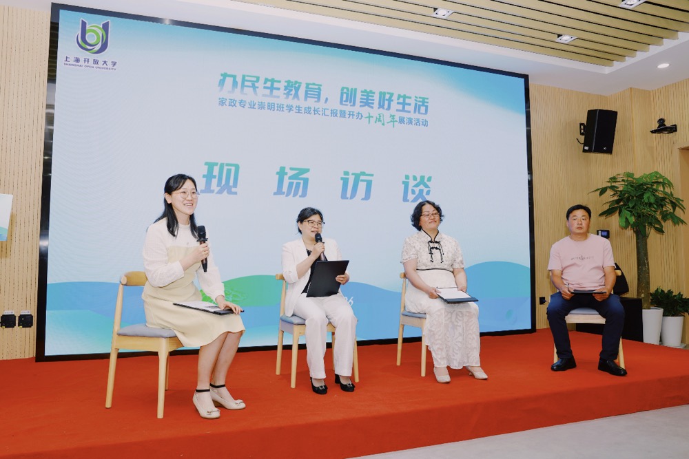 在现场访谈环节,2017级黄娟回忆,从上开大毕业后,她凭借过硬的专业技能和职业素养,从超市营业员成长为一家市区公办医院的保洁部领班;2015级徐松有分享了在校学习后的回乡创业故事,如今他在崇明建成了一个集生态、景观、休闲游憩功能于一体的“林下跑道养鱼基地”。他们的故事激励着一批批崇明籍学生投入学习。