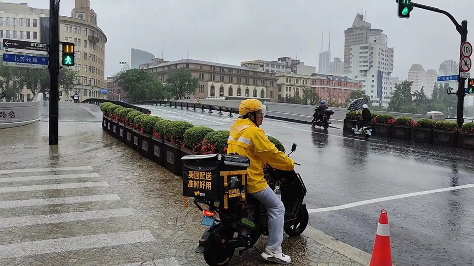 尽管上海遭受强降雨影响,但快递小哥们仍旧奔波在城市的街头巷尾,他们争分夺秒,把一份份餐食送到市民手中。