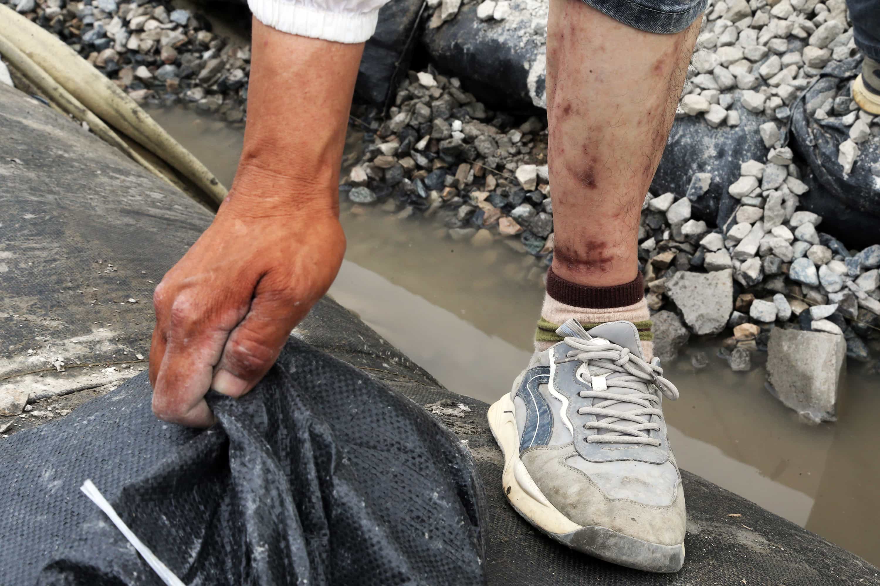 滩涂湿地是个生态宝地,蜻蜓、蚊子、螃蟹总是陪着程东干活,蚊虫是毒辣的,一咬一个包,几天也消不下去,程东撩起裤腿挠痒,意外露出了大片伤痕。程东告诉记者,工地环境就这样,天天搬运成袋碎石,大家身上多少都会带点擦伤,夏季高温,衣服更加透气单薄,相比冬季更容易受伤。