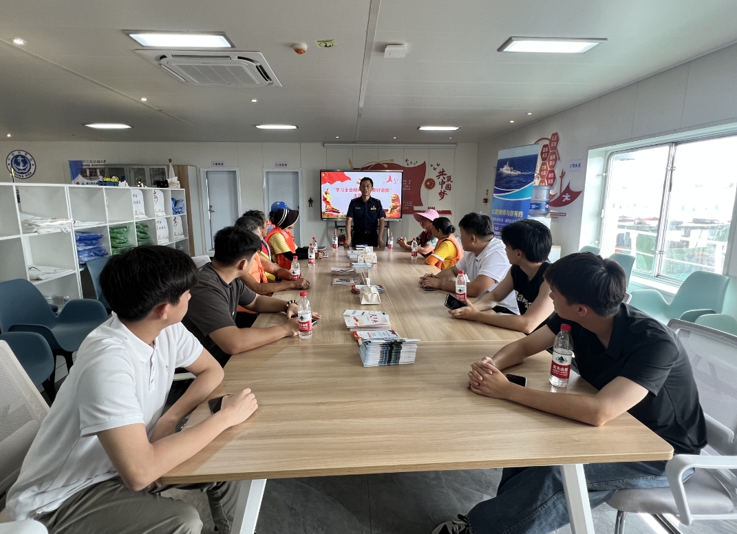 蒋兆明围绕大会报告,结合海事和航运发展实际,用一个个鲜活的事例讲解了学习贯彻党的二十届三中全会精神的重要意义,以及如何将全会精神转化为推进交通强国、海洋强国建设和航运高质量发展的强大动力,激励船员朋友们“听党话、感党恩、跟党走”,在党中央的坚强领导下,手拉手,肩并肩,共同建设更加美好的明天。此外,他还向船员朋友们介绍了最近生效的《上海黄浦江通航安全管理规定(2024))》新修订的内容,并向他们赠送了规定合订本。