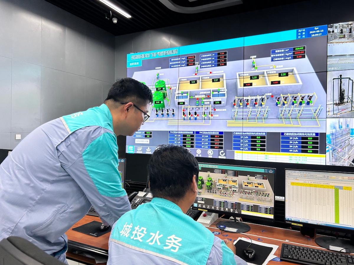 虹桥污水处理厂的中控室内,副厂长黄晓俊(左)紧盯监控屏幕上的数据。