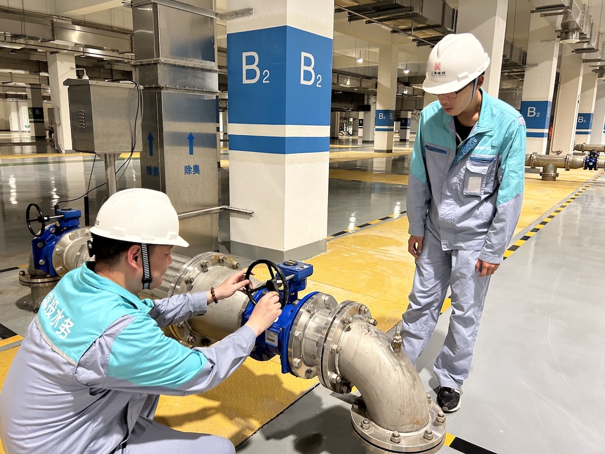 虹桥污水处理厂职工检查设备运行情况。