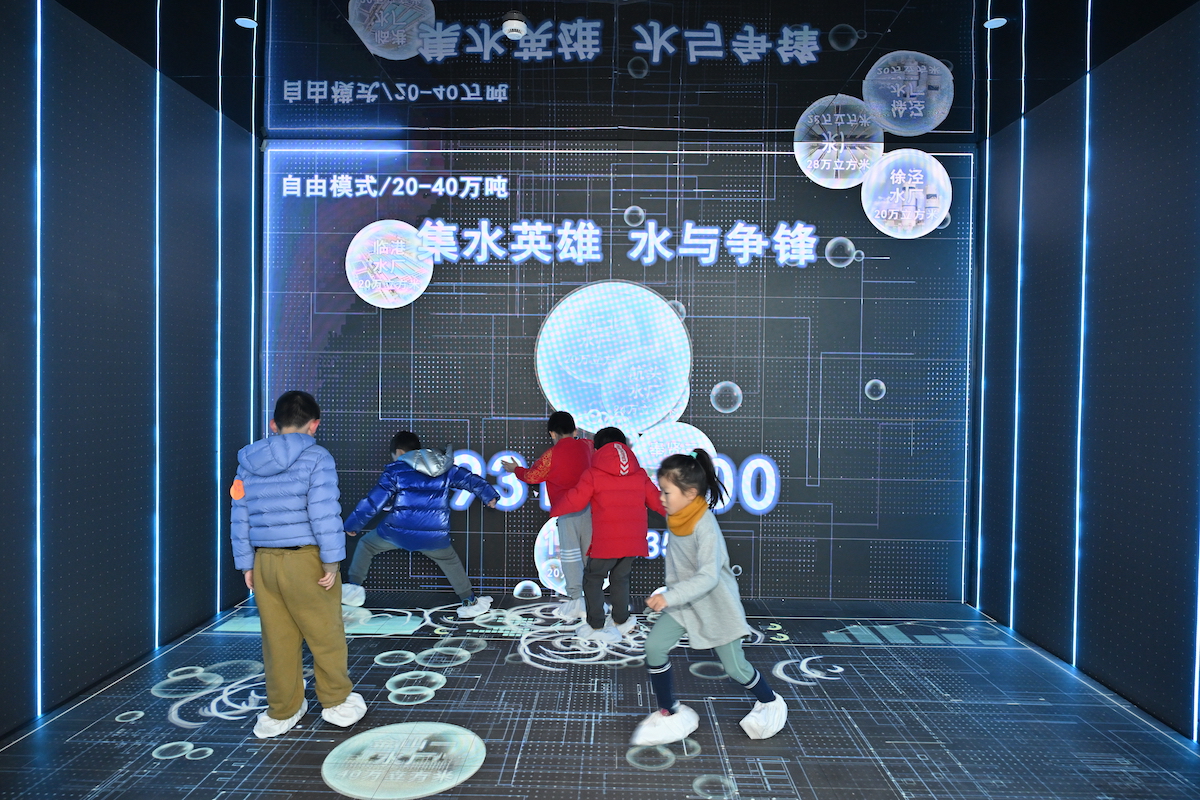 在自来水科技馆,孩子们沉浸于“集水供应互动踩吧”的趣味互动中。