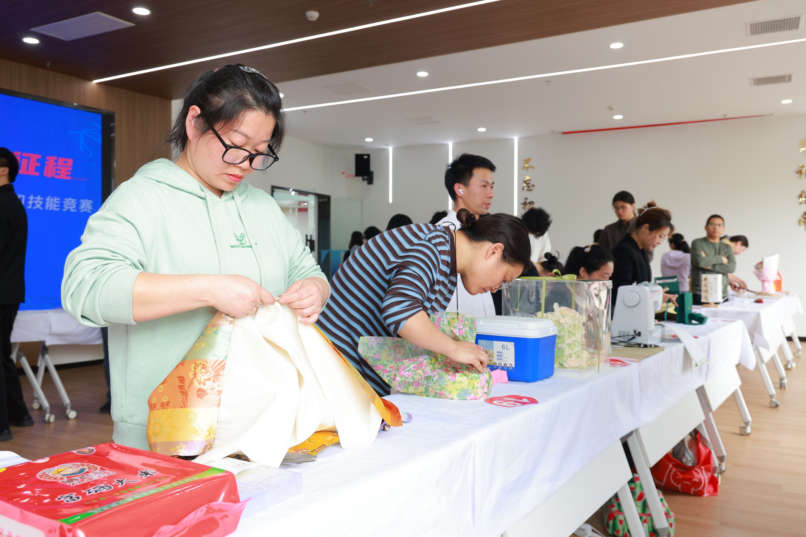 剪刀划开包装纸的“沙沙”声、丝带缠绕的“窸窣”声交织在一起,选手们的手指灵活舞动,竹编花篮、丝绒礼盒、鲜花礼袋逐渐成型。近日,由松江区总工会指导、方松街道总工会主办的“匠心礼韵・包装未来”商旅产品创意包装职工劳动和技能竞赛火热开展。来自泰晤士小镇的网红书店“钟书阁”、鲜花店“今生喜”、知名精品商店“杂物社”、首饰店“MGS曼谷银”等40余名商户的一线职工们积极参赛,用创意与巧思为商旅产品注入新活力。