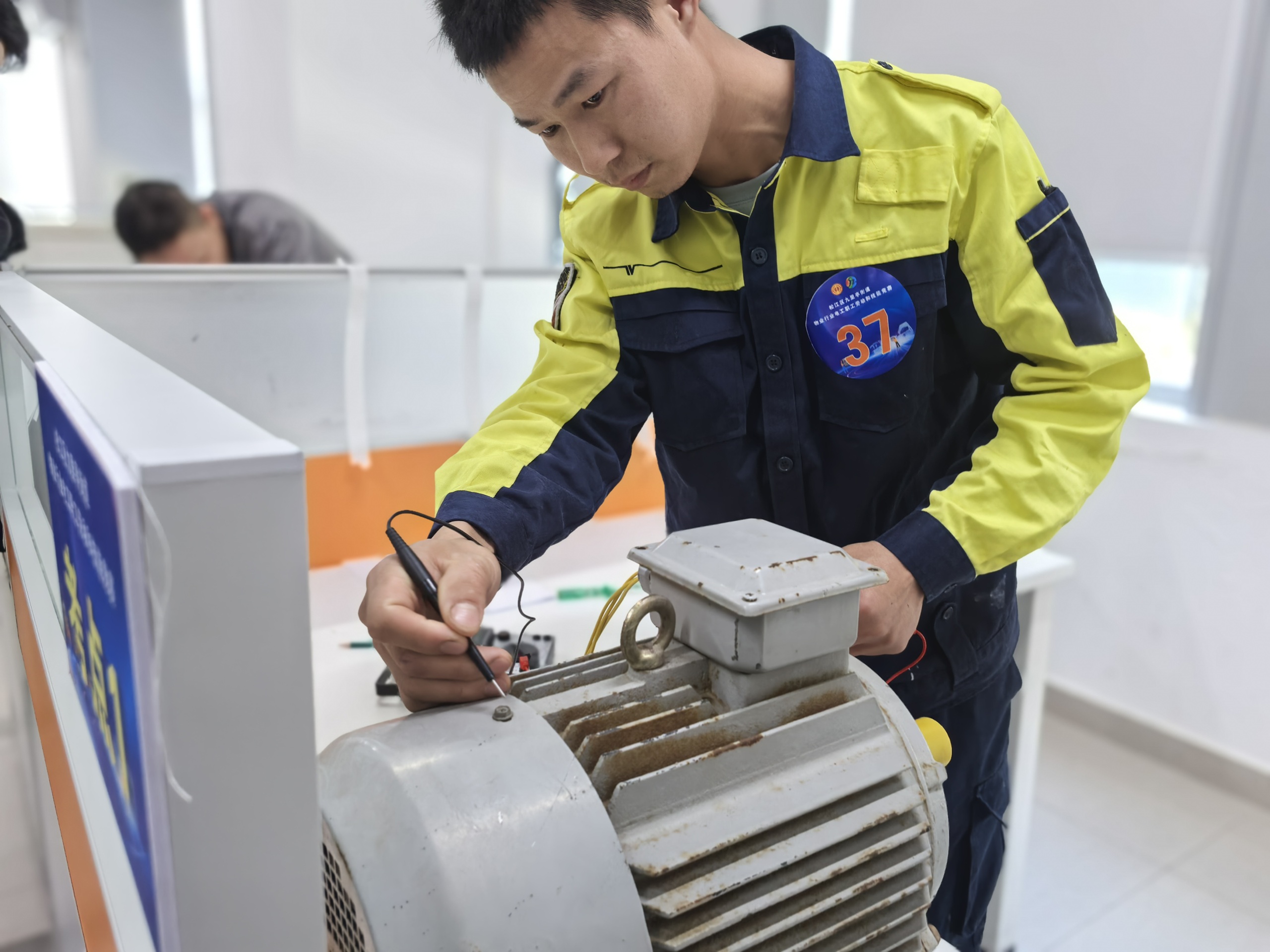 竞赛准备阶段,组织参赛人员进行线上培训,通过云端课堂,对选手们就比赛原理图绘制、实操线路故障排查等进行指导与专业讲解。比赛现场设置5个考点,参赛选手们根据抽签顺序,依次在相应点位进行比赛。竞赛内容聚焦电缆敷设与接线、原理图及控制系统图绘制、现场故障排查与修复等核心技能。赛场上,选手们一手持图纸、一手持工具,一根根红线、黄线、绿线,一个个小马达、小线圈、小灯泡在电工师傅们的检查与操作下“正确归位”,规范排列。