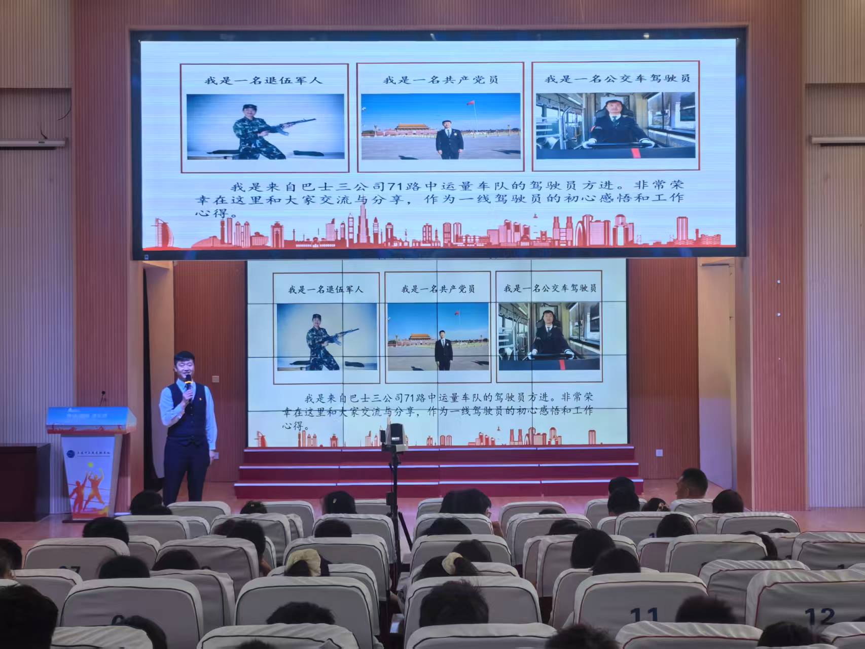“‘手握紧方向盘,脚下稳控电门,路况再复杂,也要保证车厢稳如泰山。’这不仅是公交司机的职责,更是对职业的承诺。”方进用朴实的语言,分享了日常行车中那些平凡却动人的点滴——如何在细微之处保障安全,如何在繁杂路况中保持平和。一个个真实而充满责任心的故事深深打动了在场师生,现场掌声阵阵。同学们深刻感受到,伟大的劳模精神就孕育在年复一年、日复一日的脚踏实地之中,平凡岗位一样能铸就不凡业绩。