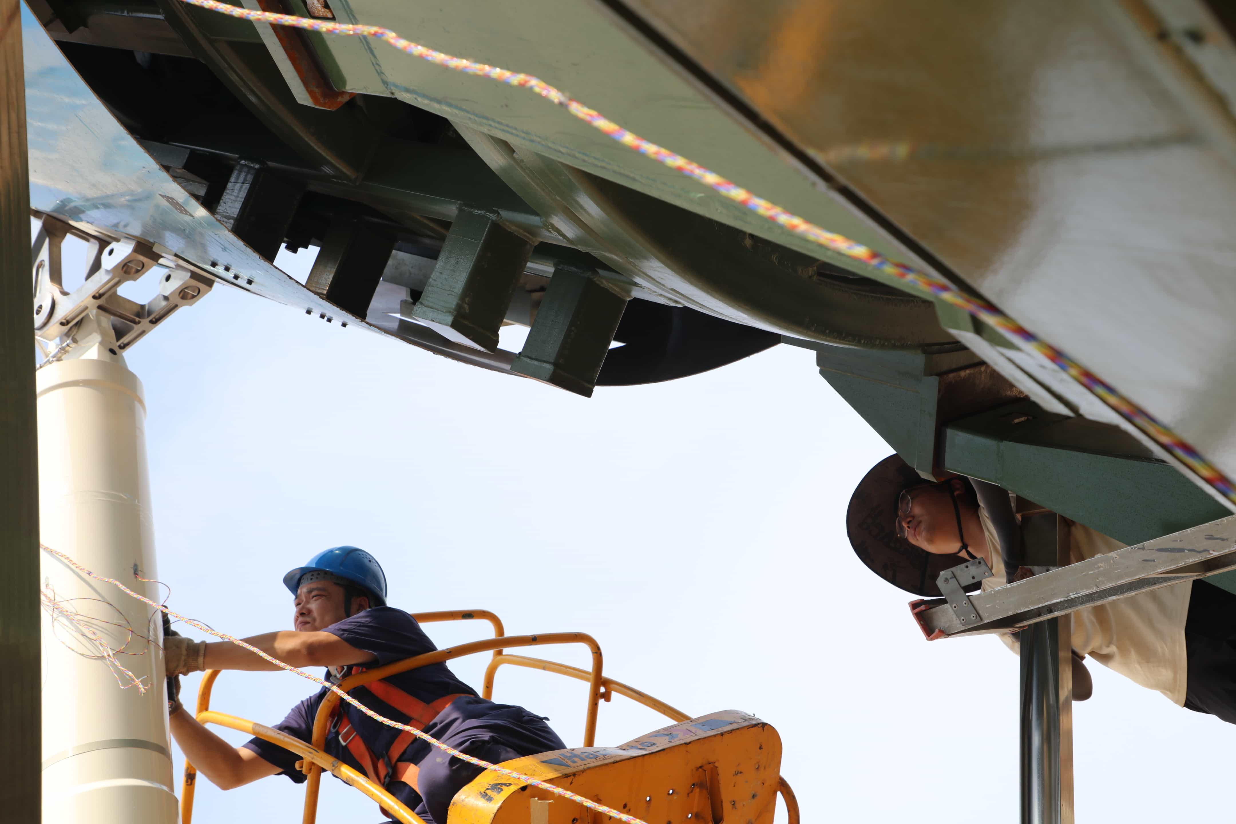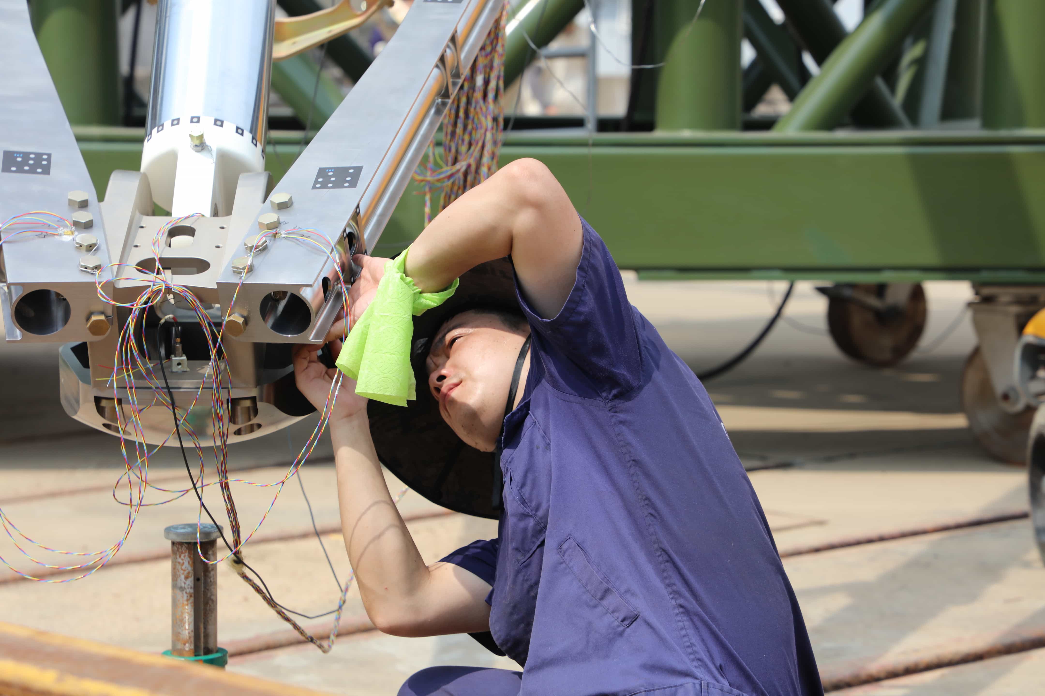 记者在现场看到,配合上提前制作出的“工装”(专用工艺装备,是航天产品研制中为实现特定工艺要求而专门设计的制造工具集合),运载火箭零部件伫立在户外试验场,面对这个巨型的工作“伙伴”,沈师傅常需要登高作业。作为从业13年的老钳工,只见他动作娴熟地系紧安全绳,毅然登上10米高的可升降移动平台,在各个零部件间辗转。“夏天金属表面温度超50℃,但戴手套会影响手感。”沈师傅的工装服被汗水浸透,安全帽下的脸颊布满汗珠,还泛起微红,额前的头发也早已湿了大半。但他顾不上这些,始终紧盯手中的传感器,仿佛周遭酷暑与他无关。