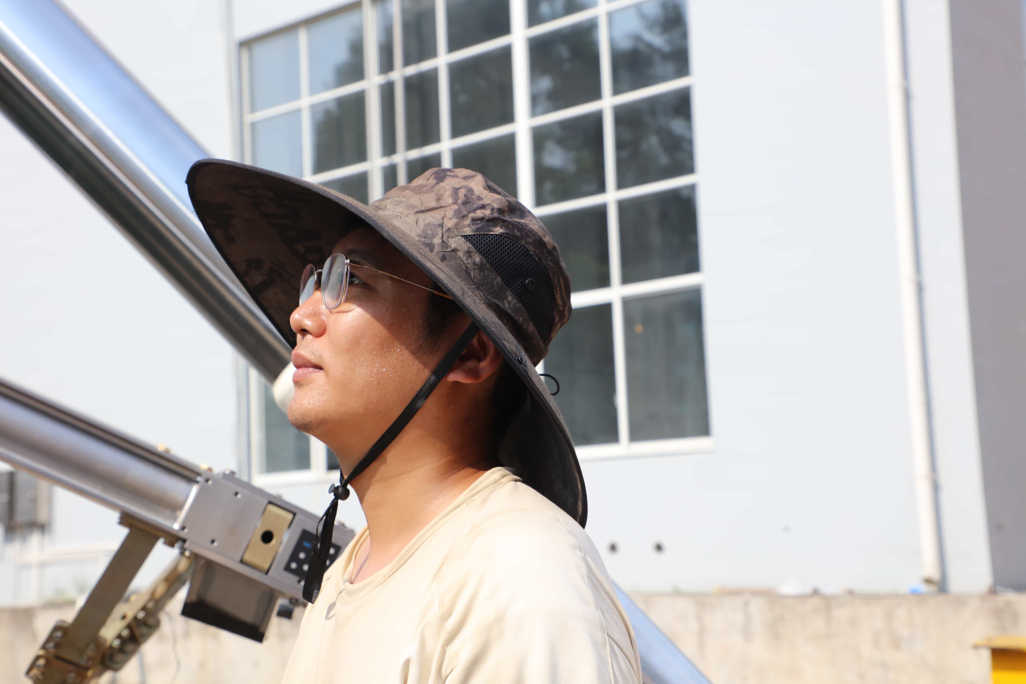 (潘浚铭在户外试验场指导现场工作,脸上布满汗珠。摄/朱兰英)