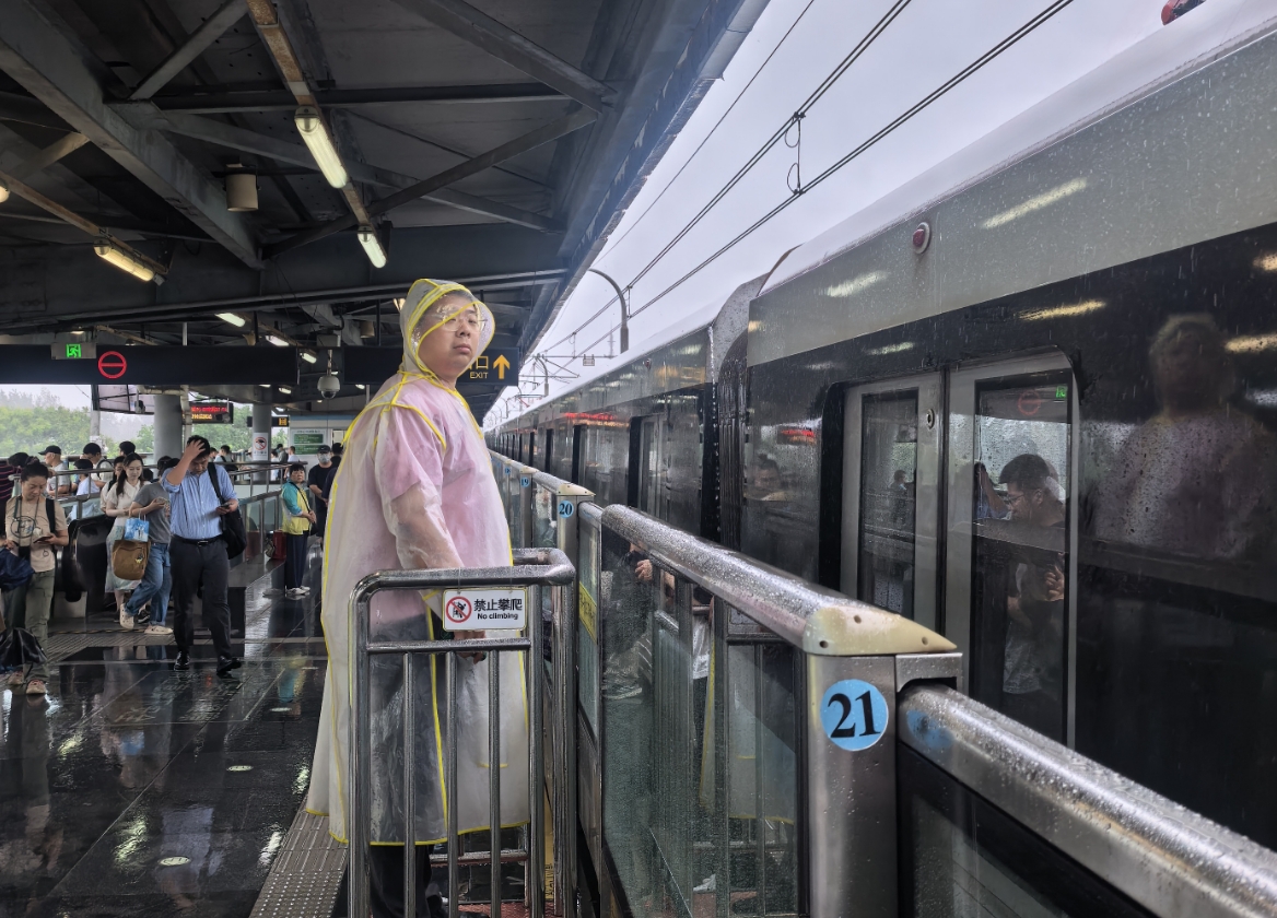 早高峰时段,全线网21条线路所有列车按时上线运营。各车站职工全员到岗,做好各项防汛防台工作:在出入口、站厅站台、换乘通道等区域铺设防滑毯、阻水带,设置温馨提示牌,持续加强广播引导旅客有序乘降,防止滑倒摔伤。与此同时,各车站职工特别是露天、半露天车站职工加密了站台巡视频次,密切监控实时雨情,及时使用除水板对积水区域进行除水作业。