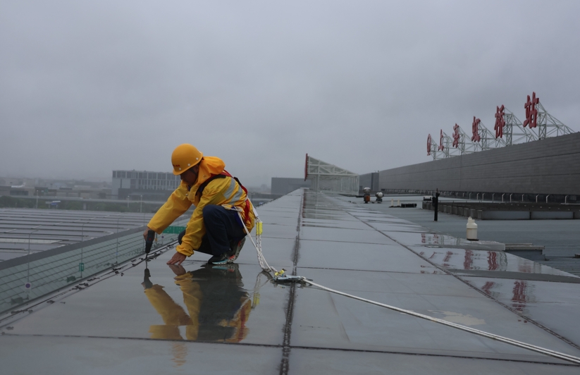 在巡检现场,工作人员踩着积水、扶着护栏,对雨棚屋面板的固定螺栓逐一检查,对檐口板、吊顶板的松动迹象仔细排查。他们攀上爬下清理天沟杂物,确保落水管排水通畅,避免积水倒灌侵蚀站房结构。针对轨旁可能脱落的伸缩缝盖板、防水卷材等部件,反复确认加固情况,坚决杜绝“空中坠物”威胁行车安全。截至目前,相关车间已累计出动巡查人员765人次,在风雨中筑起了一道“移动防线”。