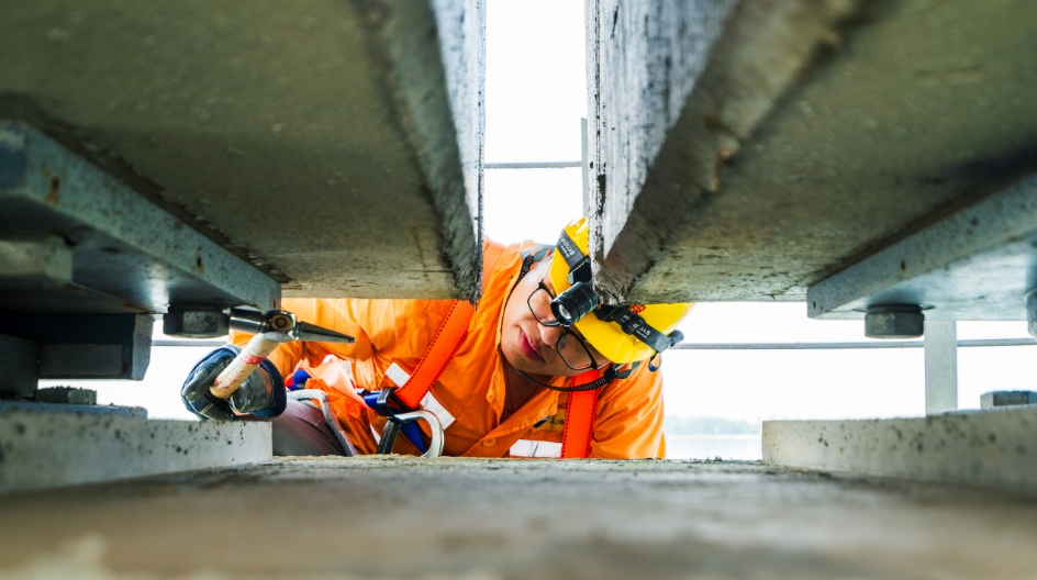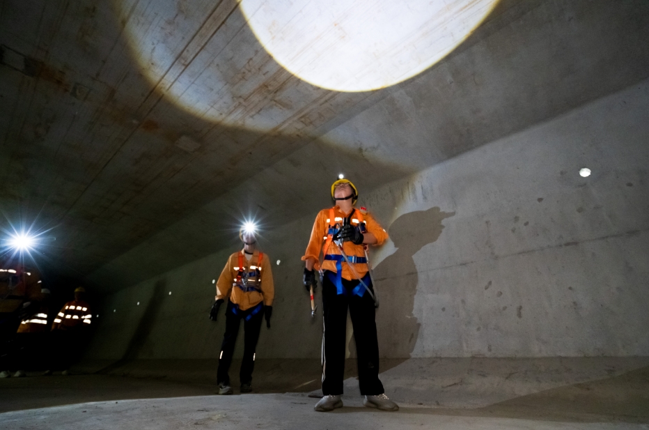 碧波荡漾的元荡湖,上跨一座数公里长的高铁桥梁,这便是陈冲等人当天的检修对象。陈冲穿好防护服,确认好携带工具和人数,又特地回检修车上拿出一瓶1.5升的矿泉水挂在身侧,组织众人通过大桥的墩身爬梯进入桥面下方的箱梁中,开始了一天的作业。此处桥梁横跨整个元荡湖,因此必须一次性完整检查6公里距离、200多个桥墩。只见他们两两一组,熟练地穿梭在高度只有80厘米的检查通道里,手持敲击锤依次确认吊围栏、U型卡扣、螺栓等零部件状态。“只要发现有螺栓松动、锈蚀,立即紧固或安排拆卸换新,确保桥梁整体结构稳定、安全。”陈冲说。