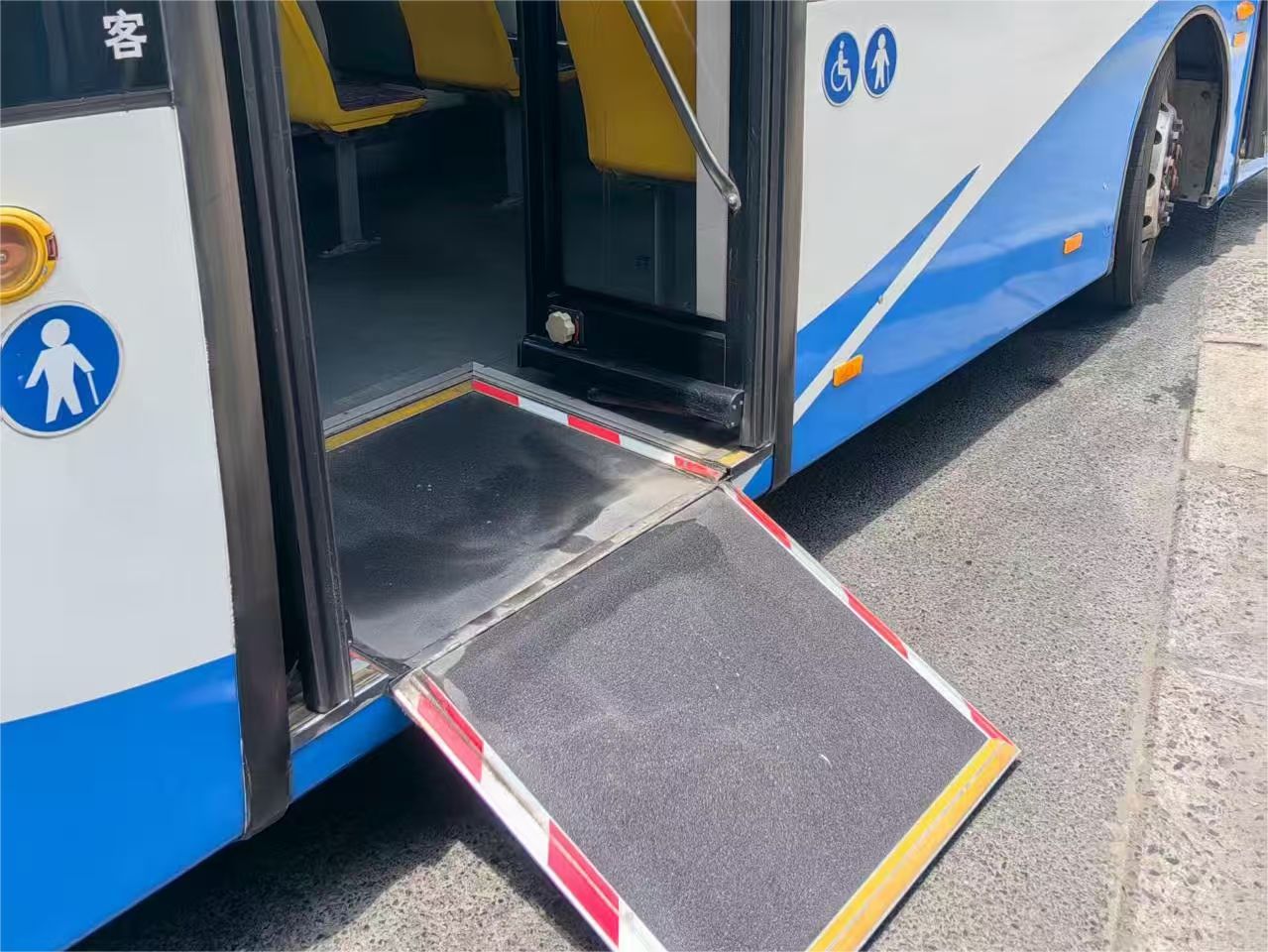 “阿姨你不要着急,我慢慢推你上车。”驾驶员张晓钢见到使用轮椅的阿姨需要乘车,将后门的无障碍上下车导板放下来后,平稳地推轮椅上车,并将轮椅固定好,让她能够安全乘车。