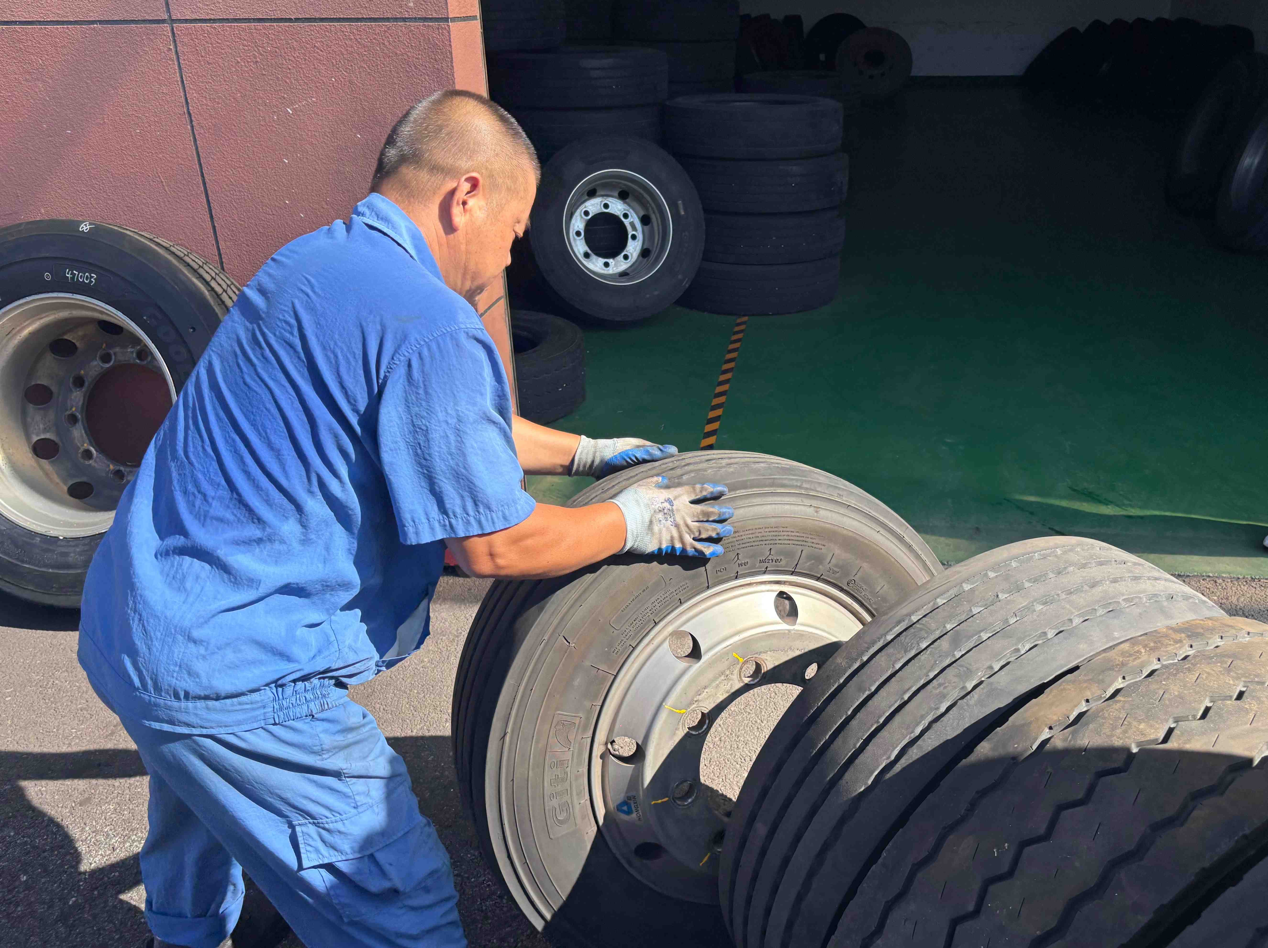 车辆轮胎被晒得滚烫,摸上去能感觉到明显的灼痛感。轮胎维修岗的师傅们正给回场车辆做轮胎“体检”。高温天里胎压波动大,稍不留神就可能埋下爆胎隐患。