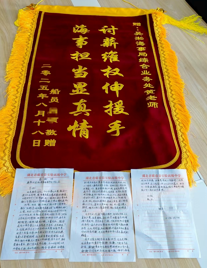 黄海龙立即与船公司取得联系,向其宣贯了法律法规关于劳工权益保障方面的规定,强调拖欠船员工资和误工赔偿的严重后果,要求船公司认真对待,履行法律义务,尽快处理该起事件。沟通的过程中,老肖情绪几度失控,他在自己的感谢信里也提及,为当时的“出言不逊”感到抱歉。