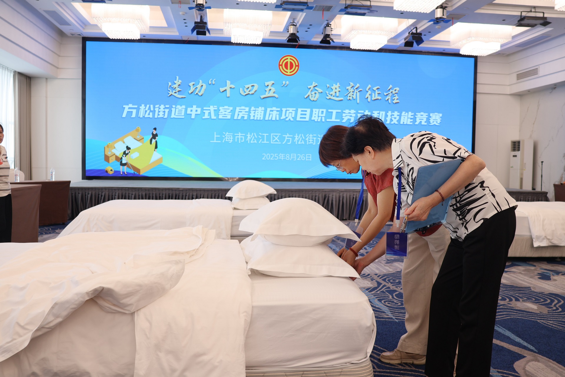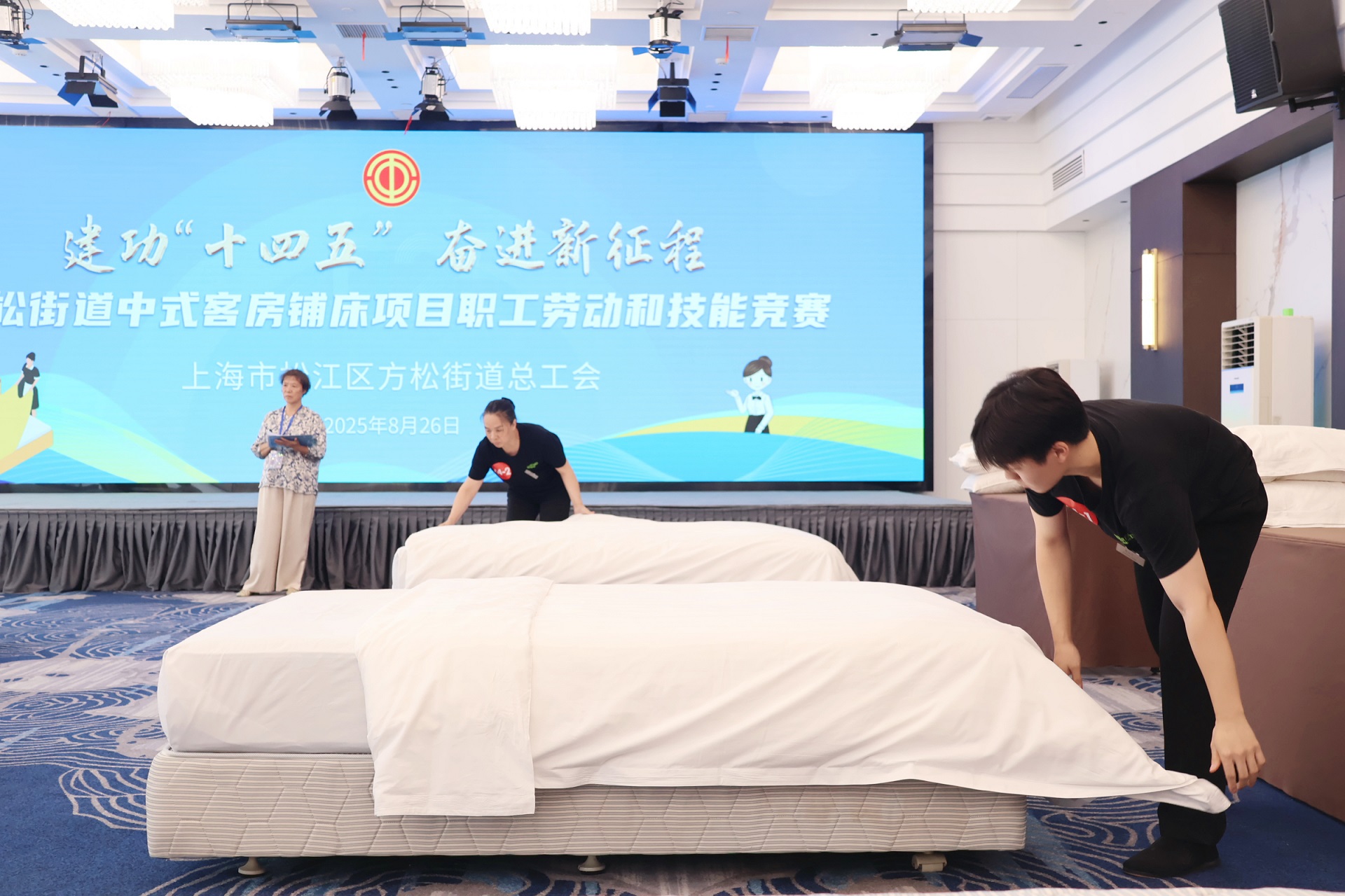 今天,“建功十四五、奋进新征程”2025年方松街道中式客房铺床项目职工劳动和技能竞赛在上海新晖大酒店开赛。竞赛由方松街道总工会主办,突破以往专业壁垒,首次吸纳业余组选手参赛,旨在搭建专业与业余同场竞技、相互学习的交流平台,吸引了众多行业从业者及技能爱好者积极参与。
