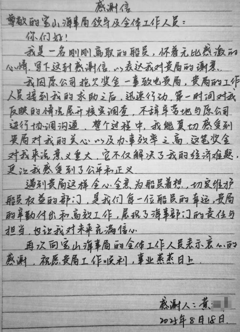 “这笔奖金对我来说意义重大,它不仅解决了我的经济难题,更让我感受到了公平和正义。”近日,宝山海事局收到一封“XX8”轮船员黄某送来的感谢信,在宝山海事的高效维权下,帮助船员速解欠薪愁。