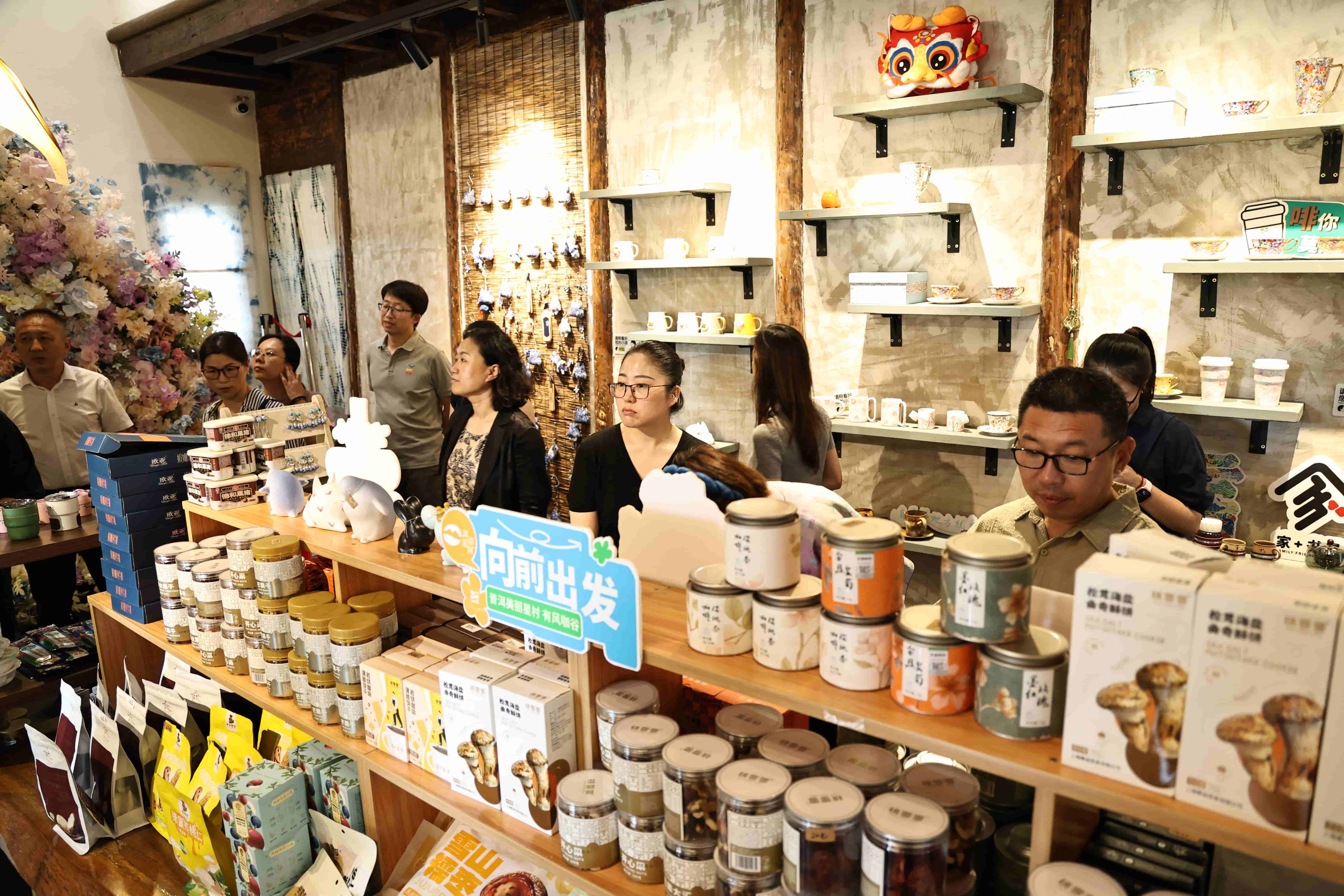 七彩独龙毯、香气扑鼻的咖啡、琳琅满目的特色手串……踏入有风小院曹路店,首先感受到的是浓郁的咖啡香与独特的艺术氛围。这里不仅是一家咖啡馆,更是一个融合了“咖啡体验+云南文创”的文化空间。活动伊始,与会嘉宾共同参观了“职工品质生活品鉴馆”,直观感受到集产品展示、文化体验、休闲服务于一体的职工服务新空间,馆内陈列的来自上海对口帮扶地区云南的优质农特产品,以及融合海派文化与云南风情的特色陈设,给大家留下了深刻印象。