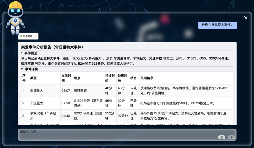 应急指挥智能体全面覆盖事前预防、事中处置、事后评估三大环节,系统能够在事前提早预警,精准掌握人、车、物等应急资源;事中实时识别5公里范围内救援力量,动态优化处置路线;事后自动生成评估报告。这一闭环管理使得城市应急从传统的“被动抢险”根本性转向“主动防御”,大幅提升城市韧性和安全水平。