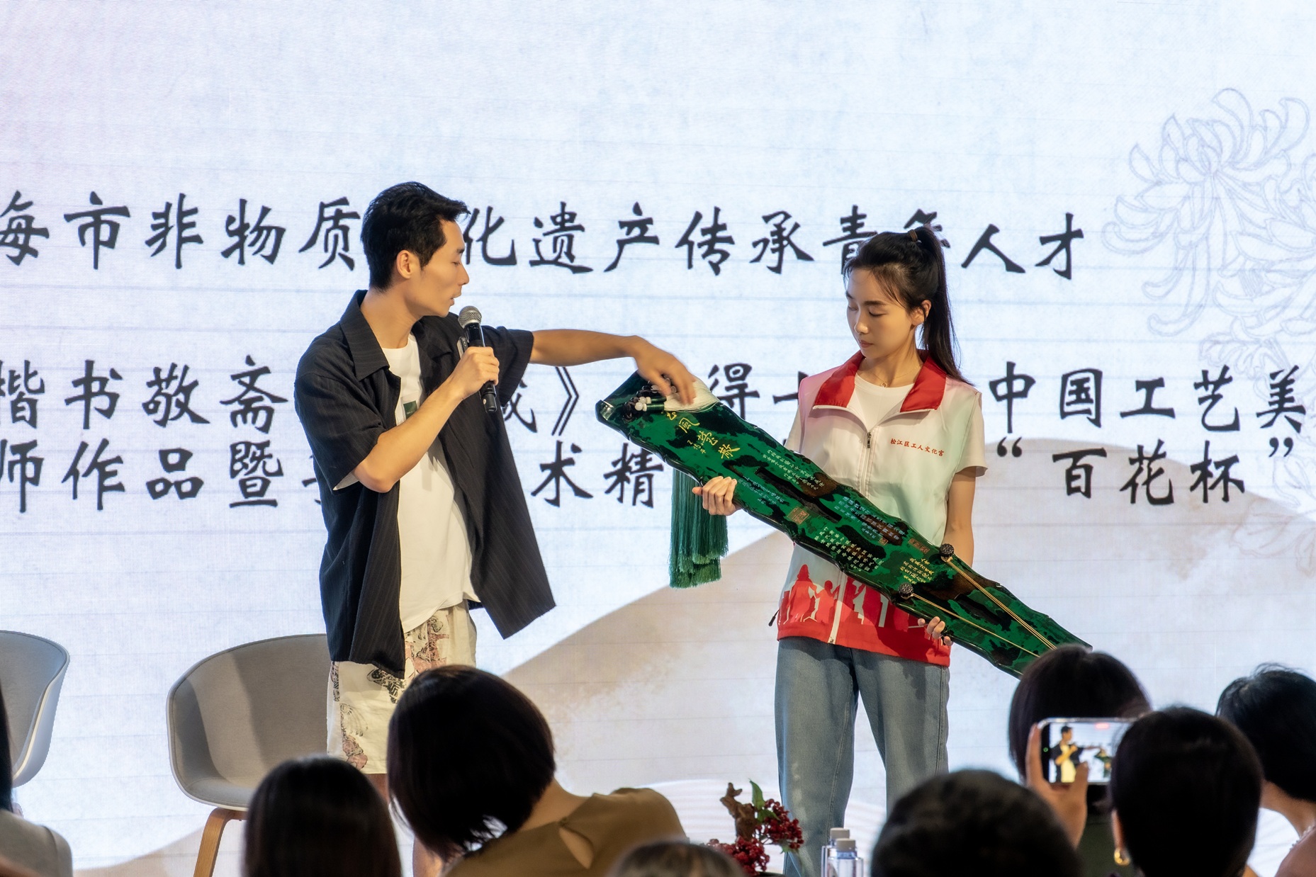 活动打破“只说不展”的传统模式,将平时难得一见的非遗精品搬到现场。松江刻漆技艺代表性传承人陈尹然带来两件作品:耗时两年多制作的古琴,融合30多种漆艺工序,从木胎处理到细灰批涂均遵循古法,琴身刻漆落款尽显雅致;清明上河图刻漆片段则通过“阳文刻人物、阴文刻水波”的技法,拉出前后空间感。陆永清及女儿陆珠荟两人,作为松江丝网版画非遗项目代表性传承人,用两件作品展示出木雕版画与丝网版画的差别。这些实物不仅印证了《手艺里的中国》中对非遗“耗时久、工艺精”的描述,更让参与者亲眼看到漆面,观察刻痕,直观感受“匠心”的重量。