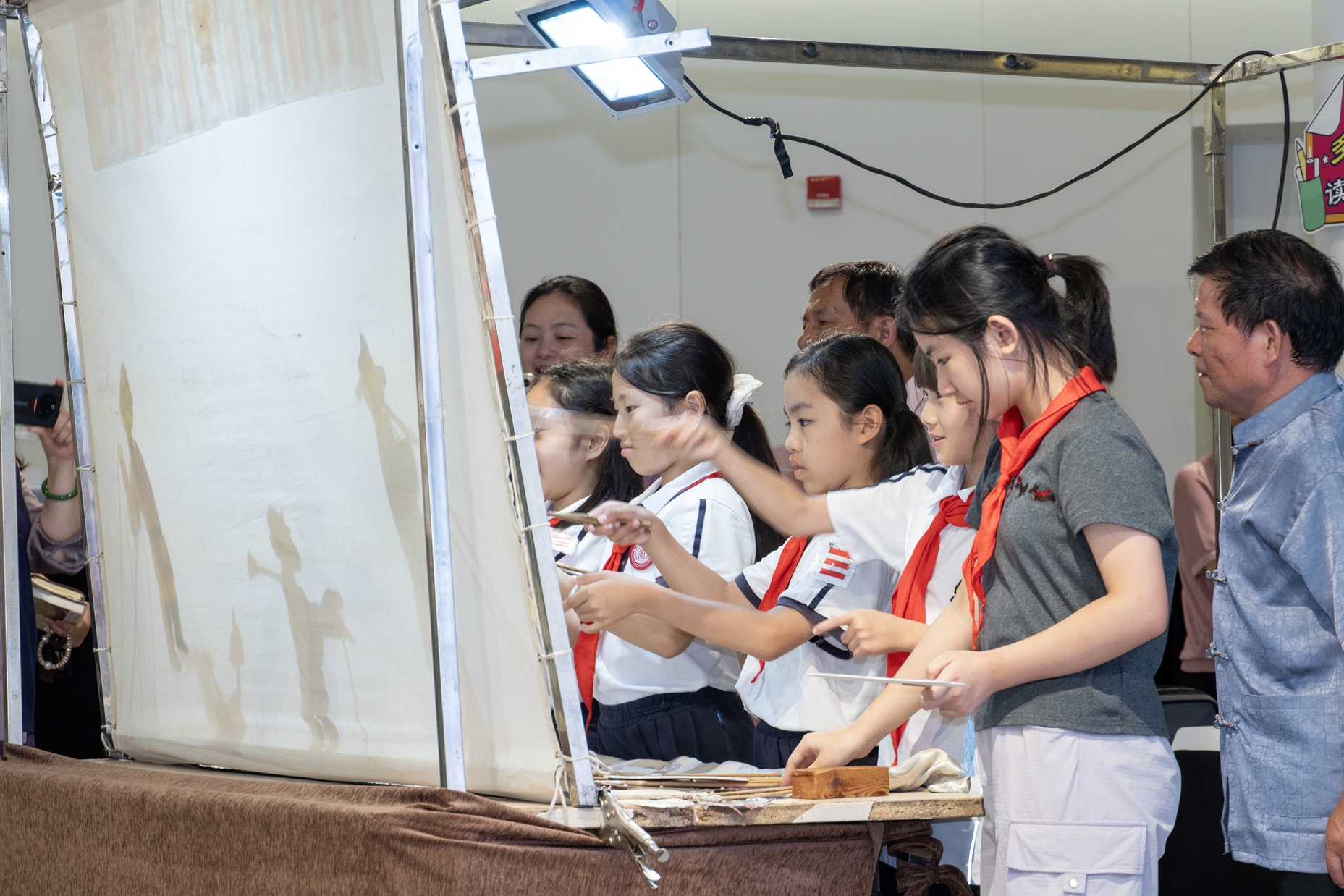 区别于单向的“知识灌输”,活动还设置“沉浸式体验”环节,让每个人都能成为非遗的“体验者”。现场职工和中小学生凭签到时领取的体验卡,可选择刻漆拓印、丝网版画漏印、掐丝珐琅等项目。在版画区,大家跟着老师学习用刮板将颜料漏印到扇面上,用刀亲手雕刻一幅简易作品;漆器技艺区,学生们耐心地一遍遍用砂纸打磨漆器;珐琅绘画区,大家学到晕染色彩的魅力……在皮影展示的幕后,孩子们好奇地围在幕布后,学习老艺人操控皮影“走路”“抬手”“翻身”,现场充满欢声笑语。这种“边玩边学”的模式,让原本小众的非遗变得亲切,许多学生说,希望以后还能体验这些非遗课程。
